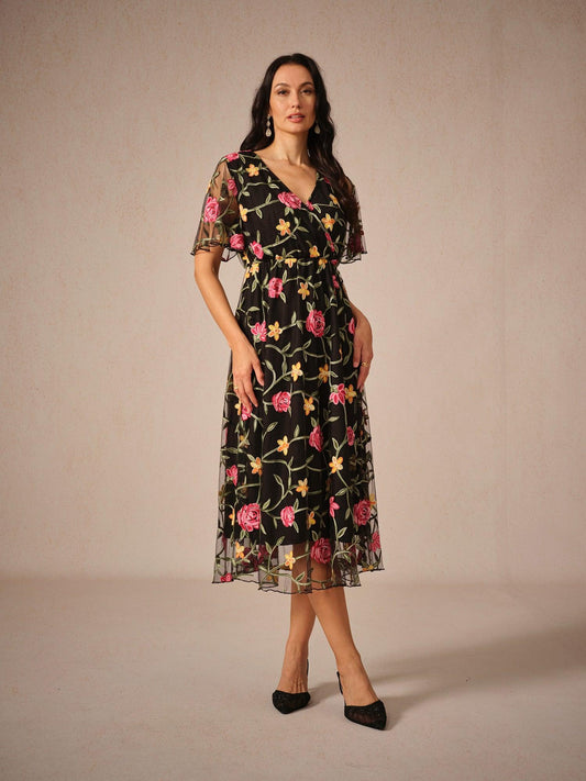 Floral Embroidery Mesh Midi Dress