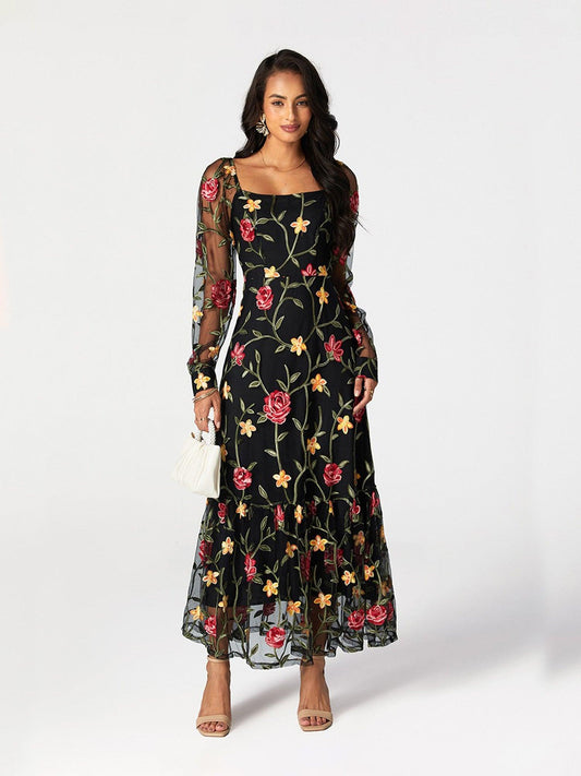 Floral Embroidery Mesh Square Neck Maxi Dress