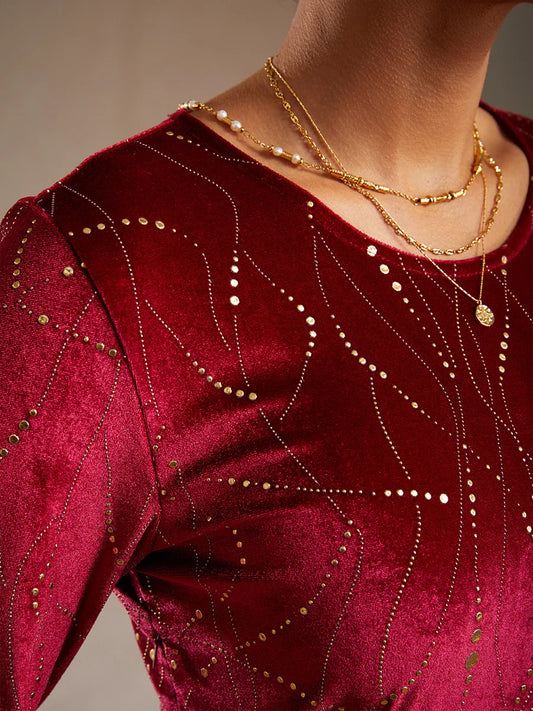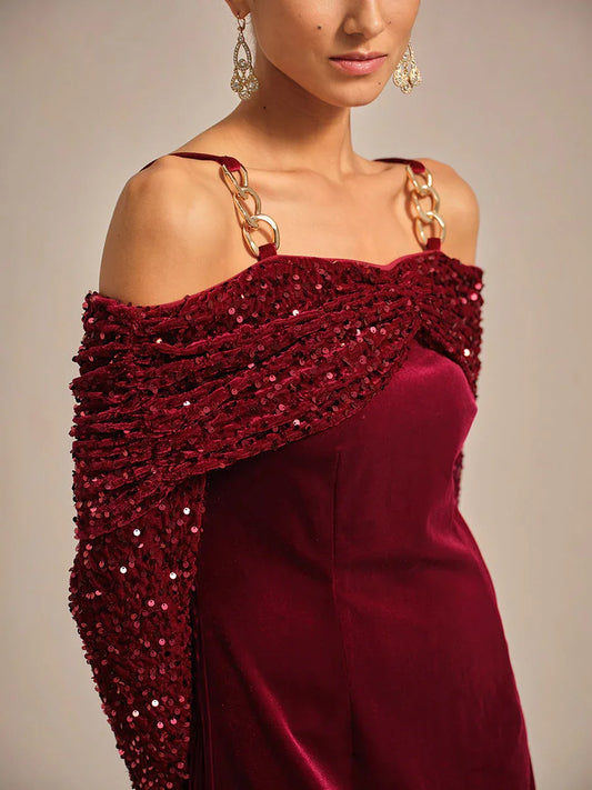 Off-Shoulder Velvet Midi Dress with Metal Ring Strap