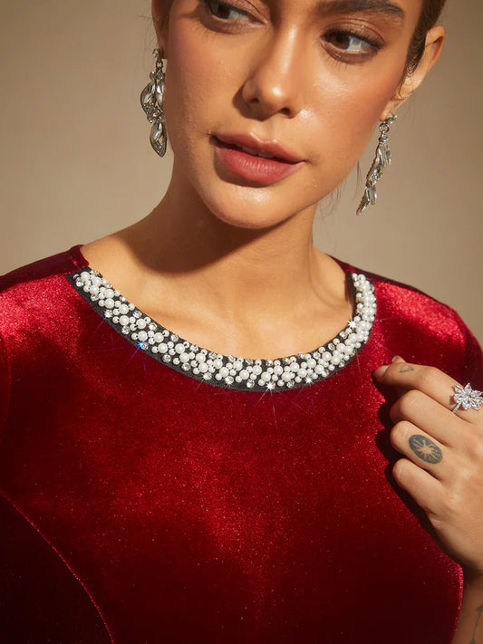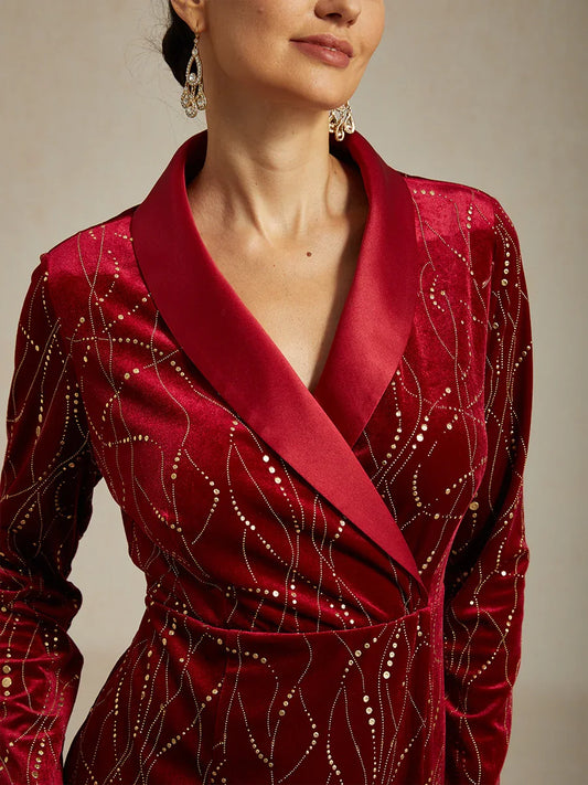 Long Stretch Velvet Evening Dress with 3/4 Sleeves