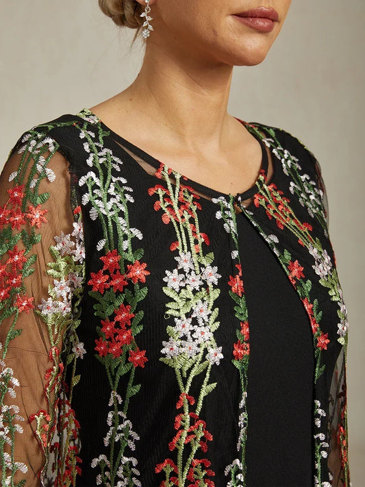 Graceful Long Lace Jacket Dress with 3D Floral Embellishments