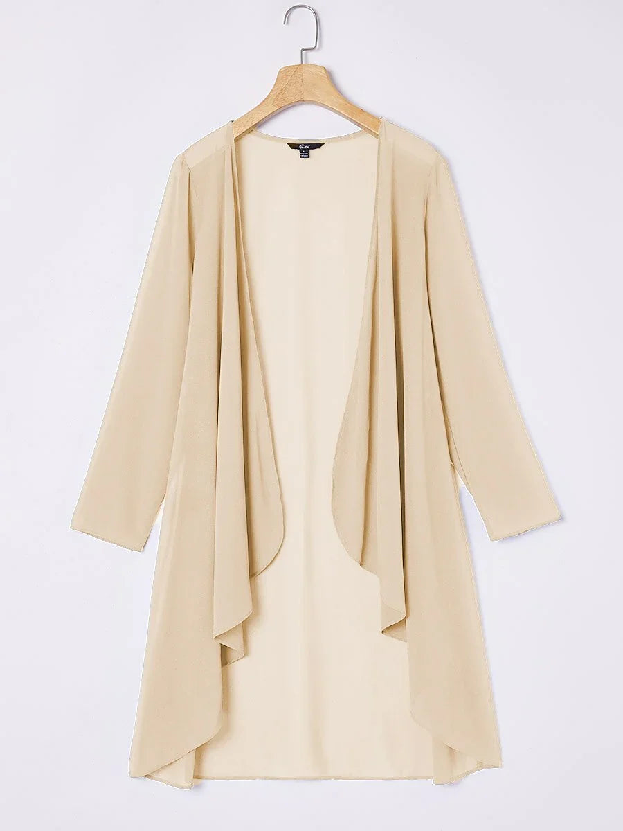 This flowy chiffon duster cardigan features an elegant high-low hemline with gracefully layered front panels that create effortless movement. The lightweight single-layer fabric drapes beautifully over dresses or tank tops, while long sleeves add refined coverage. A perfect versatile layering piece for mature women seeking sophisticated comfort.