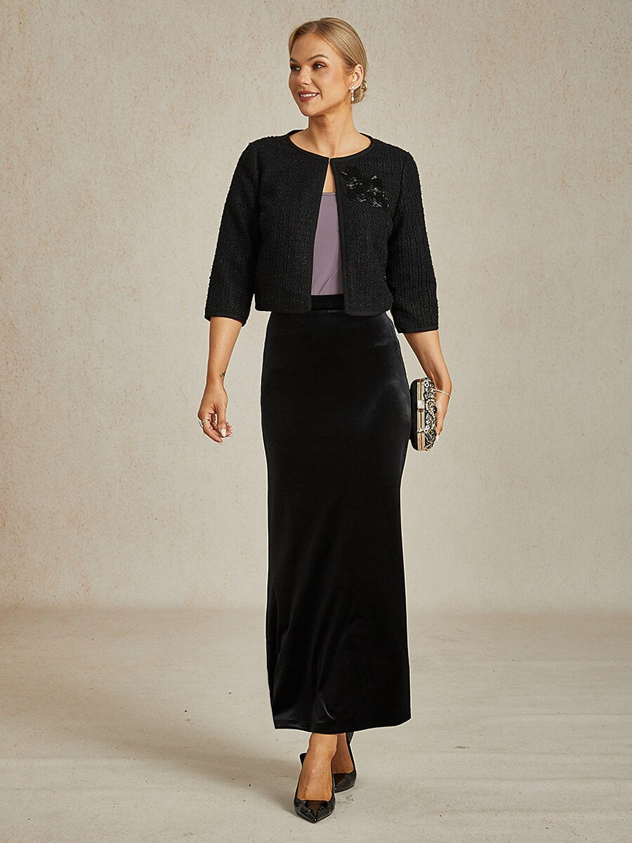 This cropped round-neck tweed jacket features 3/4 sleeves and subtle metallic silver threads woven into the fabric for a touch of sophistication. Designed with delicate beaded embroidery on the chest, it combines classic elegance with modern flair. The fabric has slight stretch for comfort, while the soft lining ensures a smooth fit. Perfect for pairing with dresses, skirts, or tailored pants, this jacket transitions seamlessly from daytime gatherings to evening occasions.