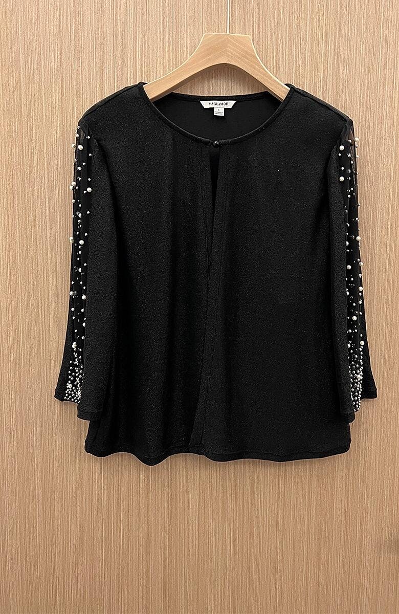 Diese anspruchsvolle 3/4-Arm Bluse hervorhebt komplexe Perlendetails an der Hüfte und zarte Illusions-Chiffonärmel für einen eleganten Look. Hergestellt aus unserem schimmerndes metallisches Strick Stoff, es bietet bequemer Stretch und passt wunderschön zu passenden metallischen Strick- oder Chiffonhosen. Vielseitig und stilvoll, ist es perfekt für sowohl für legere als auch formelle Anlässe, und verleiht jeder Garderobe eine raffinierte Note.