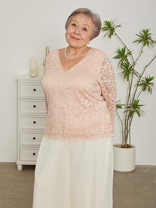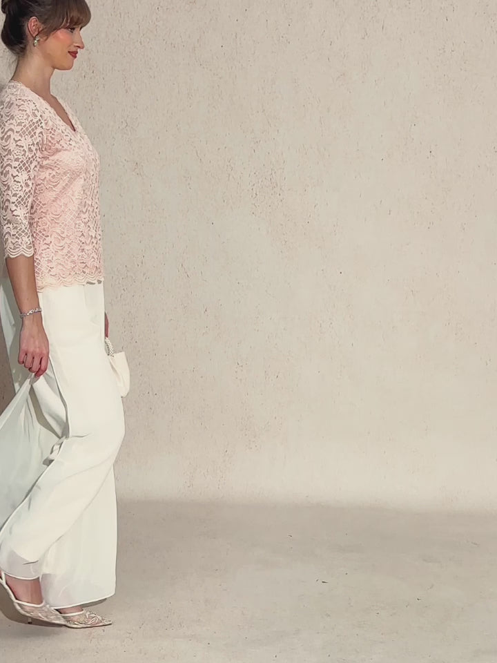 Elevate your evening style with this beautifully crafted stretch lace top. Designed with a feminine V-neckline adorned with delicate lace trim, this blouse features three-quarter sleeves and scalloped detailing at both the hem and cuffs for a graceful, romantic finish.