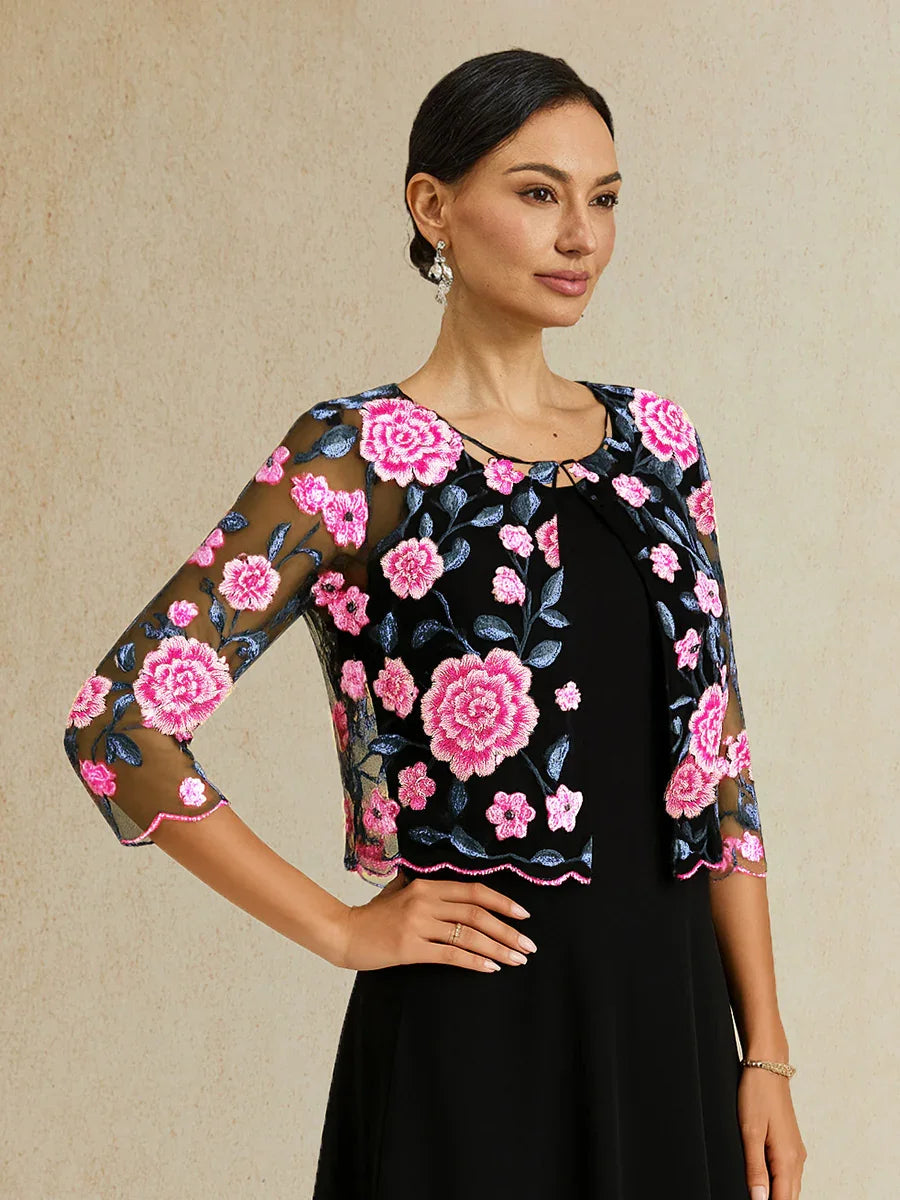 Anmutig und raffiniert präsentiert sich dieser bestickte Tüllbolero mit 3/4-Ärmeln und schmeichelhaftem, hüftlangem Schnitt. Die florale Stickerei verleiht femininen Charme, während die gewellten Kanten an Saum und Manschetten dem Ganzen einen eleganten letzten Schliff verleihen. Mit seinem Verschluss vorne in der Mitte eignet er sich ideal zum Tragen über ärmellosen Oberteilen oder Kleidern und bietet leichte Bedeckung mit romantischem Flair.