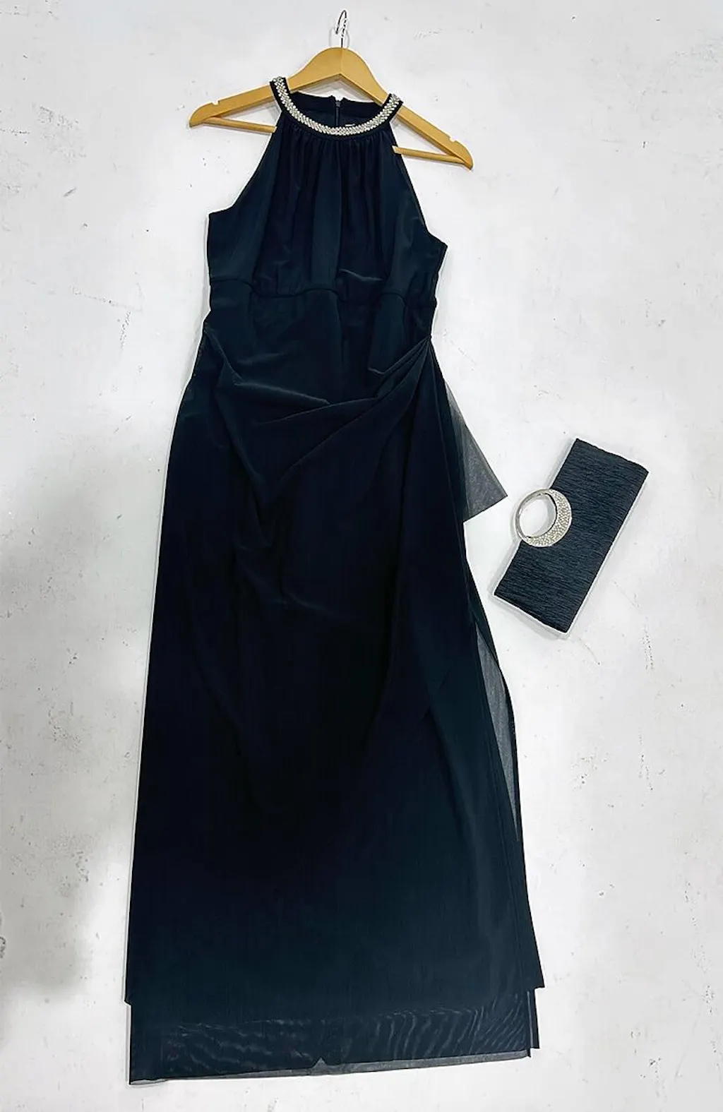 Dieses ärmellose marineblaue Kleid besticht durch eine elegante asymmetrischer Saum und ein fließende A-Linien-Silhouette. Das Kleid ist gefertigt aus floral burnout Chiffon, ein leichtes, halbtransparentes Gewebe mit zarter strukturierte Blumenmuster die Tiefe und Eleganz verleihen. Das taillierte Oberteil geht in einen anmutigen Rock über, der sowohl Struktur als auch Fließfähigkeit bietet. Ideal für Hochzeiten, formelle Abendessen oder besondere Abendveranstaltungen, dieses Kleid vereint Komfort, Raffinesse und zeitlosen Charme.