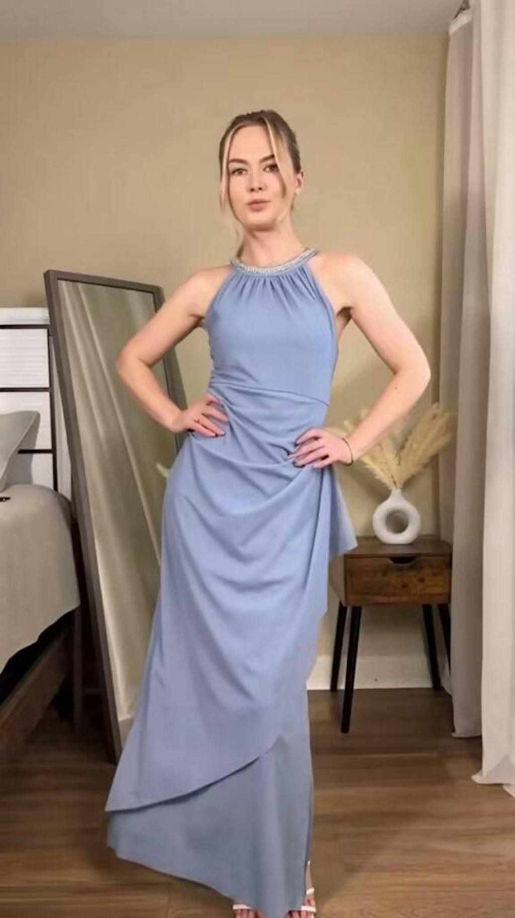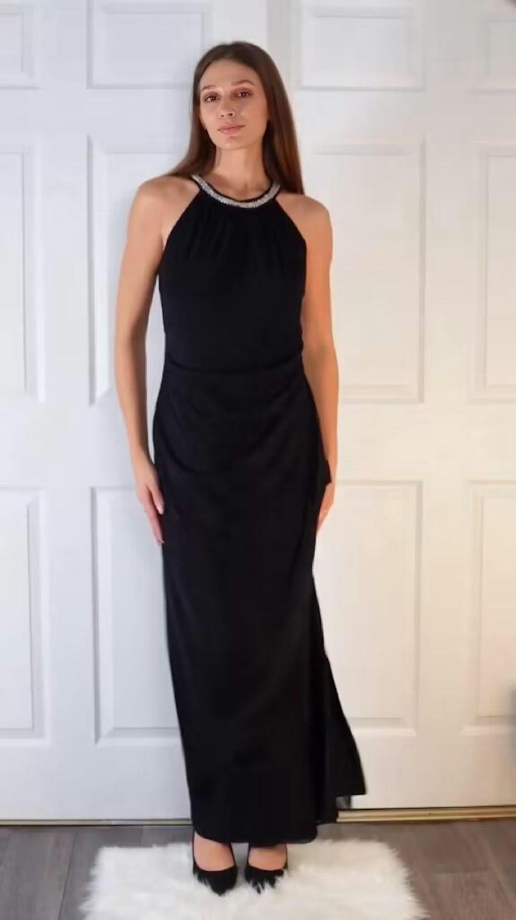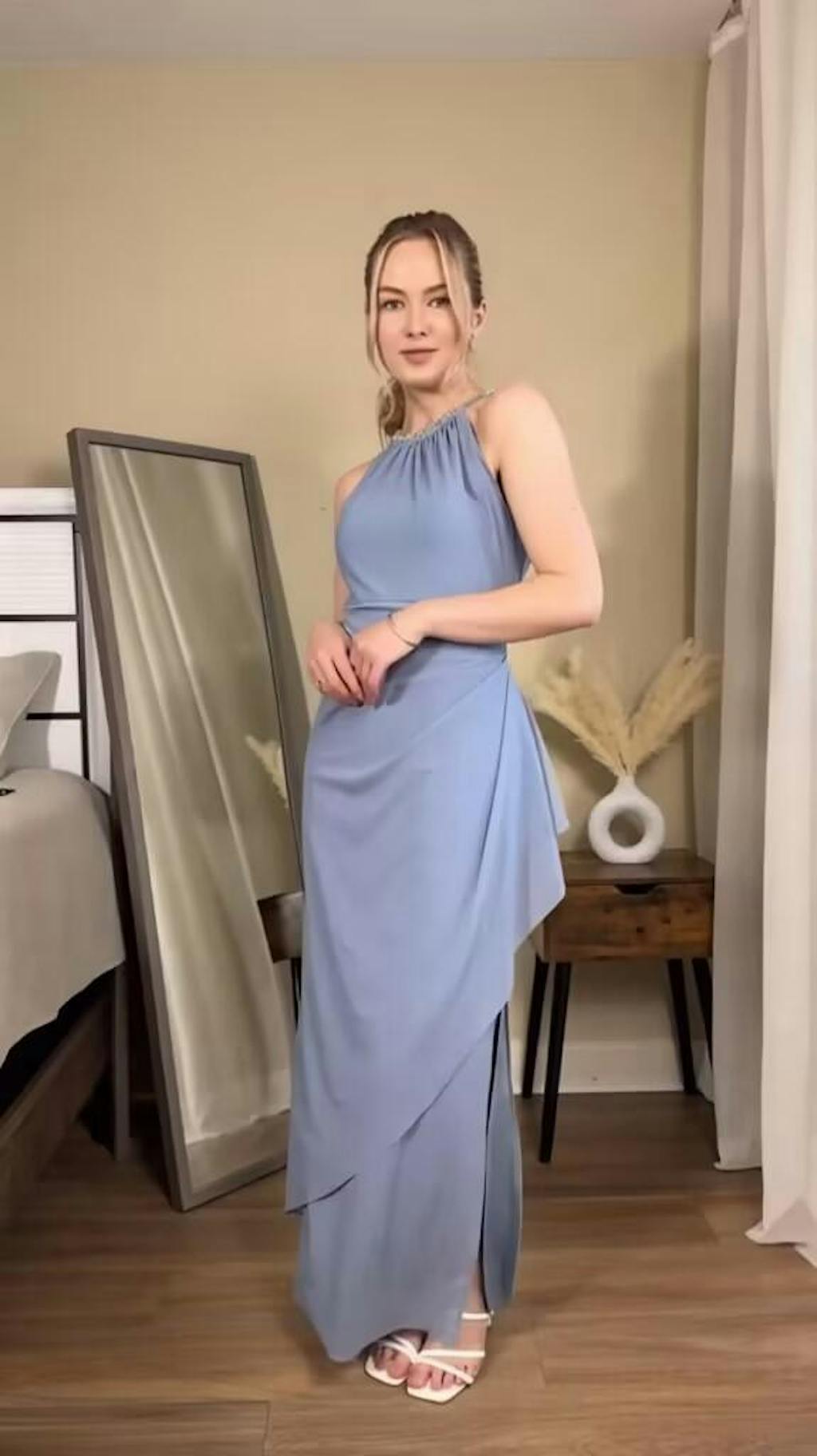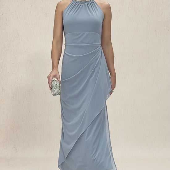 Absolutely stunning. The beaded halter sparkles softly, and the ruffle skirt moves beautifully with every step.