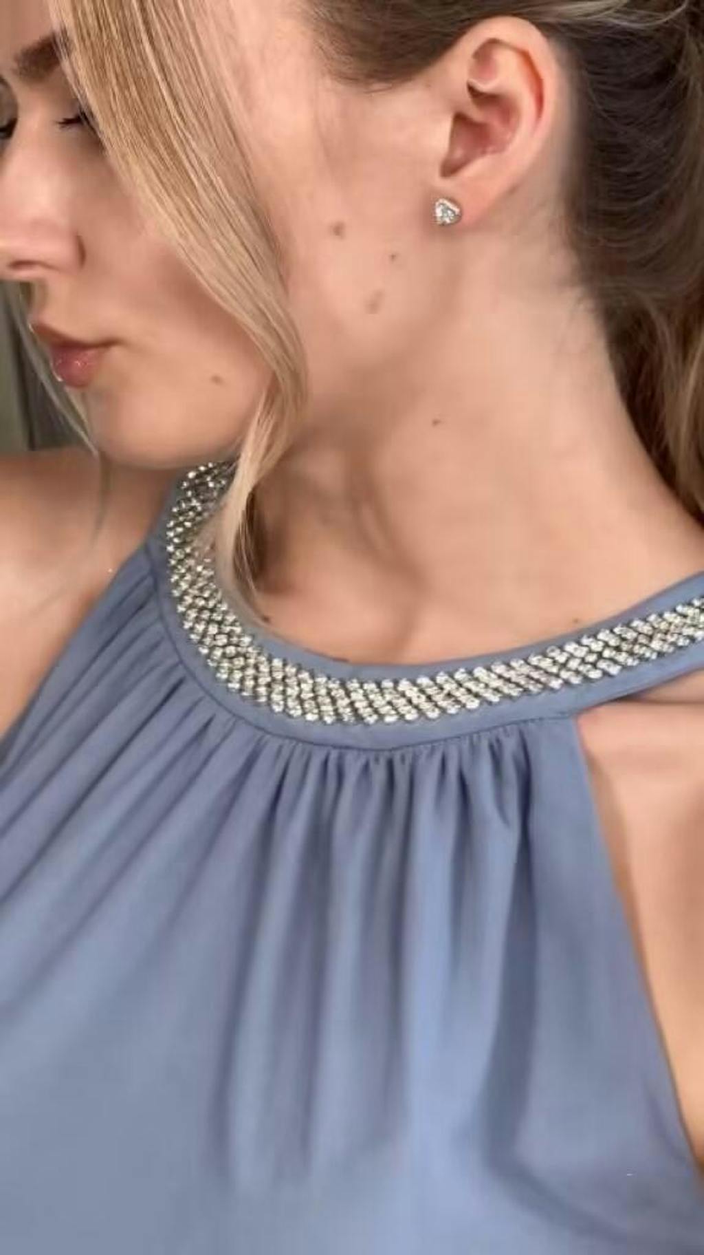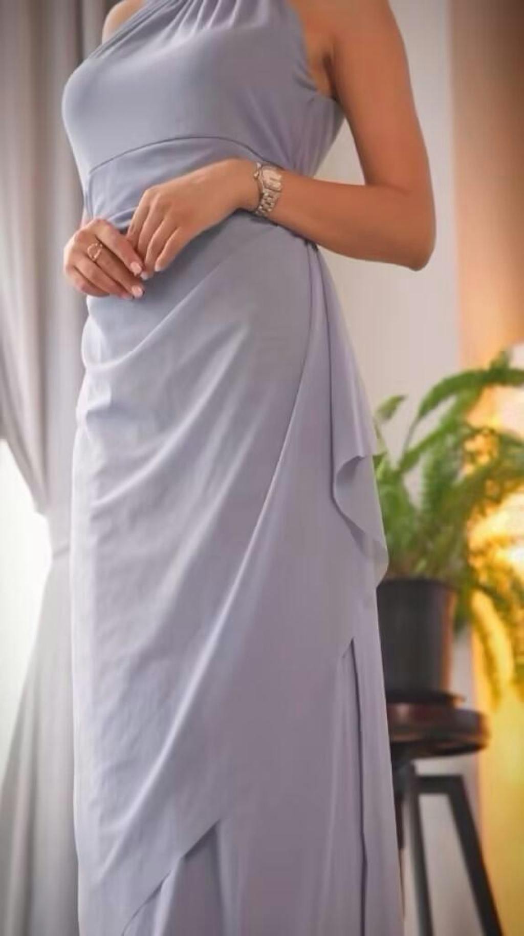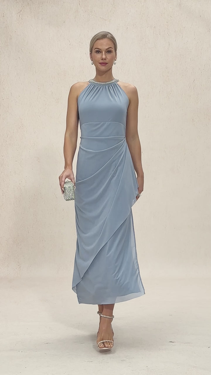 Absolutely stunning. The beaded halter sparkles softly, and the ruffle skirt moves beautifully with every step.