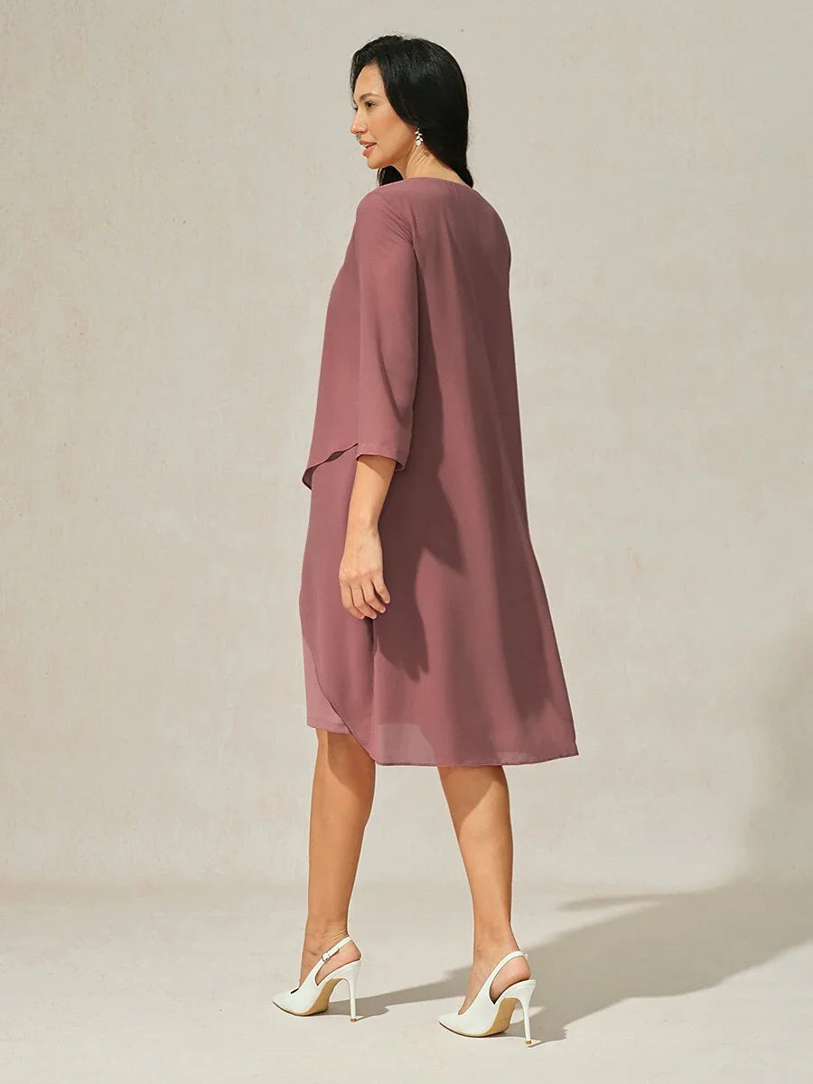 3/4 Sleeve Knee-Length Chiffon Dress with Rhinestone
