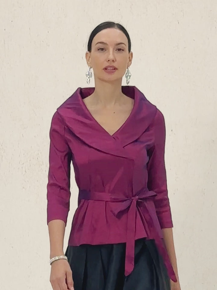 Blusa de tafetán elástico con mangas 3/4 y detalle de lazo en la cintura