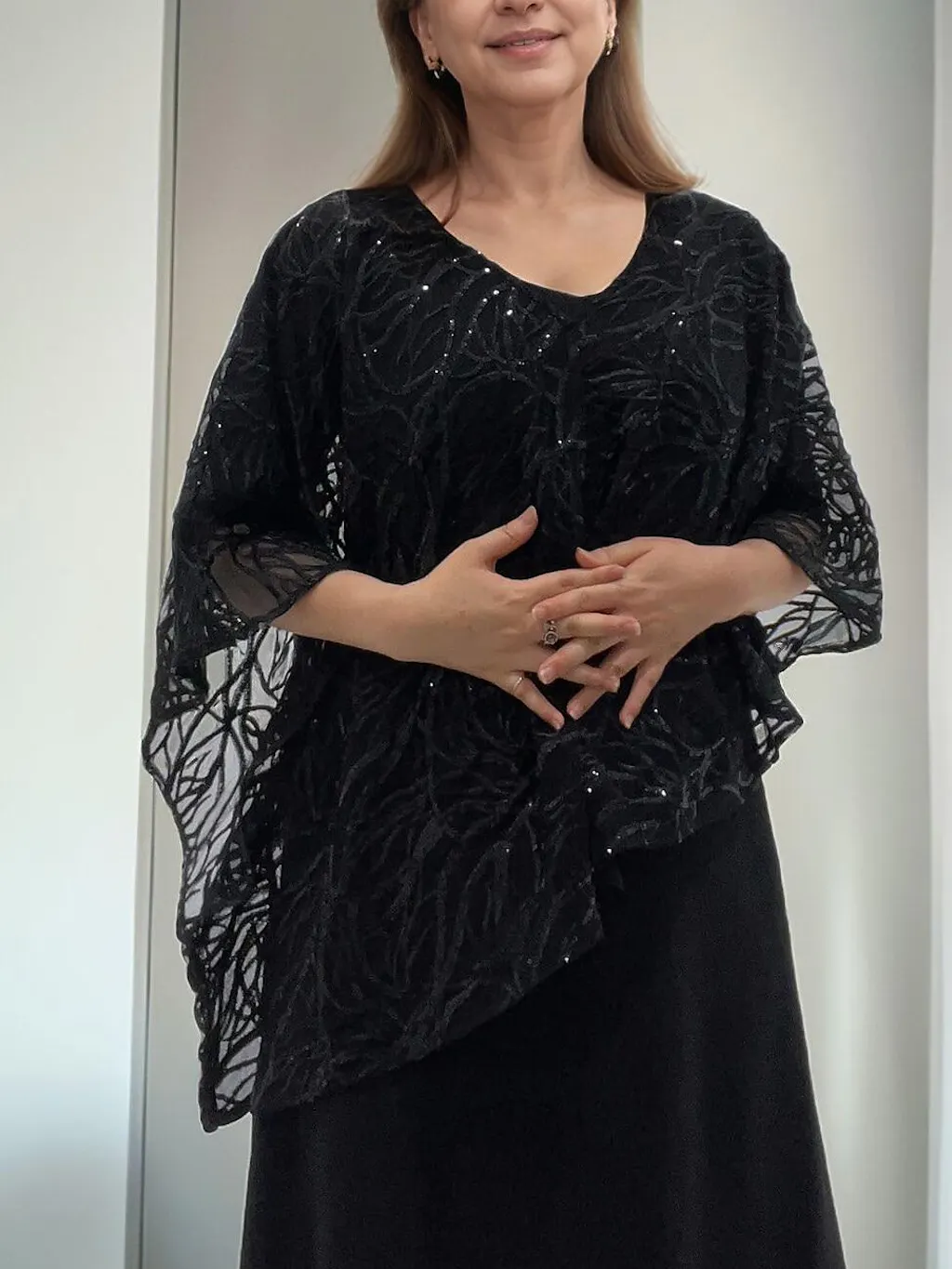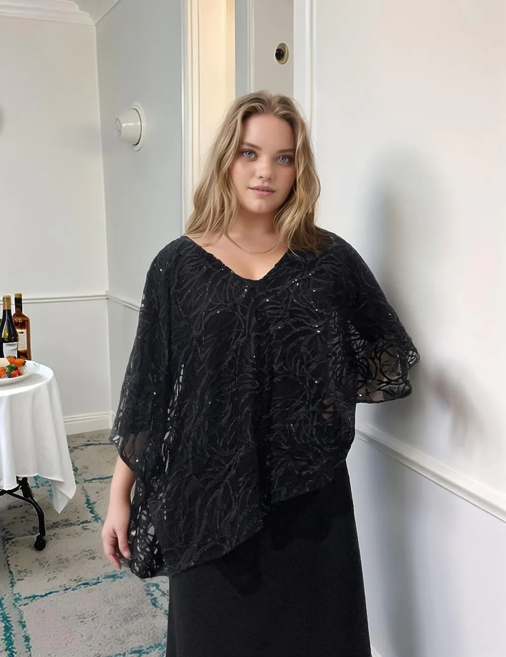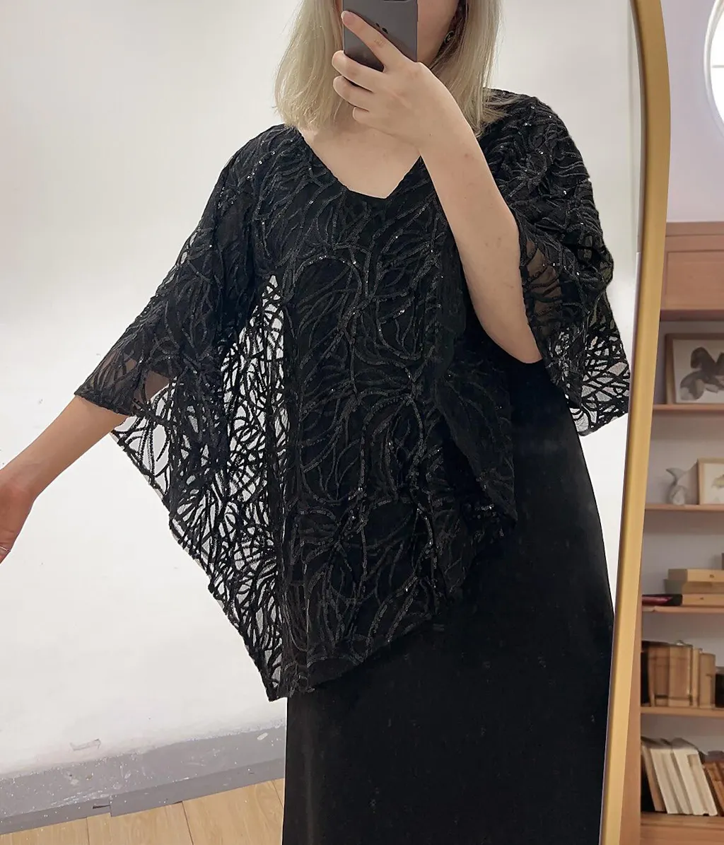 Este elegante vestido de una pieza presenta una silueta en línea A sin mangas con capas con un superposición de gasa con lentejuelas bordadas. The capa estilo sobreposición añade una cobertura elegante con bajo asimétrico y mangas tres cuartos, mientras que el vestido interior está confeccionado con tela de alta elasticidad para un ajuste favorecedor y cómodo. Perfecto para bodas, eventos formales y cenas especiales, este vestido ofrece el aspecto de un conjunto coordinado en una sola pieza sin esfuerzo.