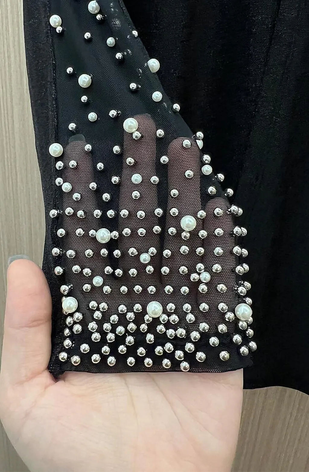 Détail perlé, manches en chiffon illusion, longueur de manche 3/4, tissu en maille extensible