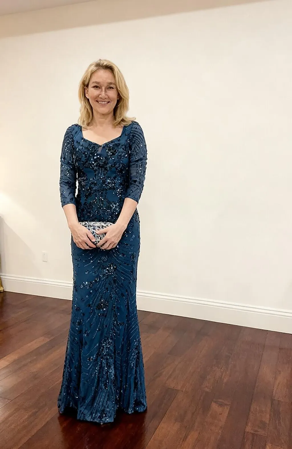 • Conception : silhouette trapèze, superposition de dentelle à paillettes, appliques de rosace, manches courtes illusion, taille ajustée, longueur au sol