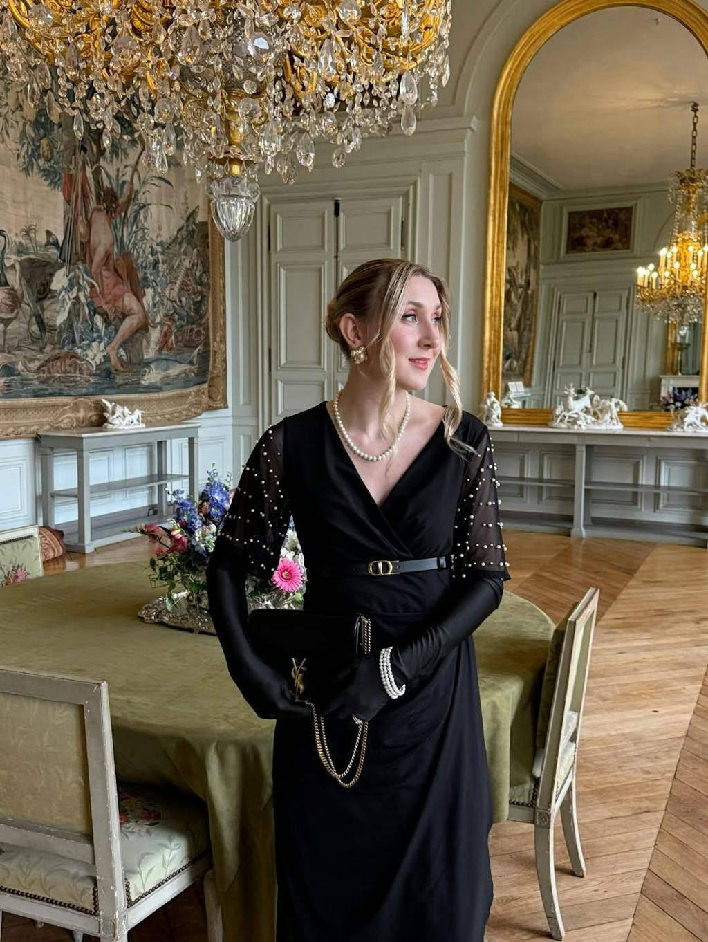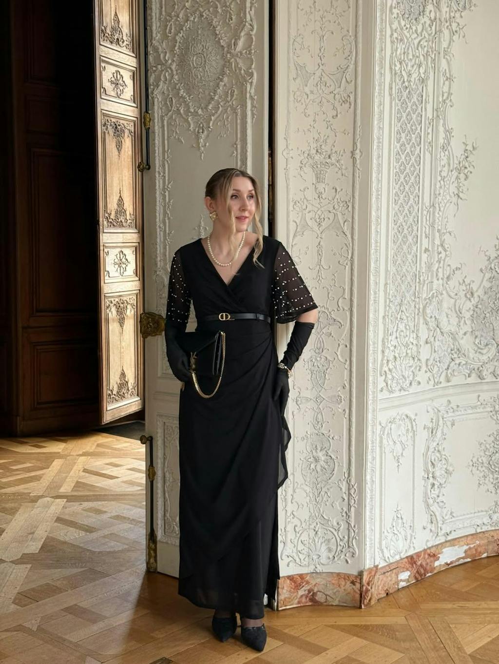 • Conception : silhouette trapèze, superposition de dentelle à paillettes, appliques de rosace, manches courtes illusion, taille ajustée, longueur au sol