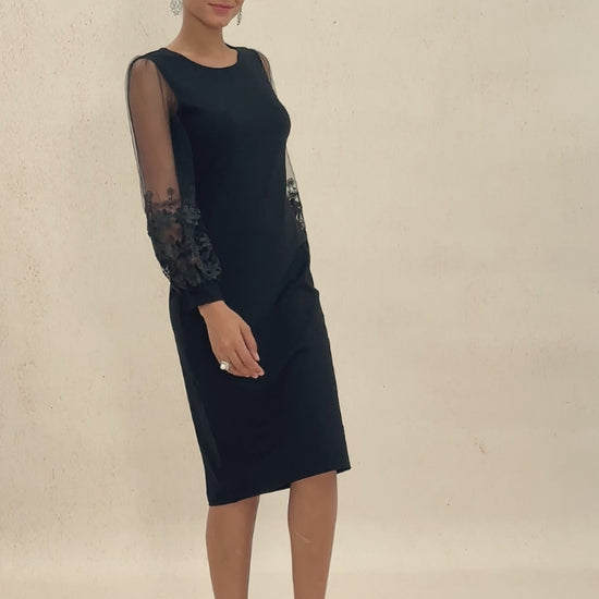 - Design : Col rond, manches évêque transparentes à fleurs 3D, silhouette moulante longueur genou avec doublure gainante pour le ventre.