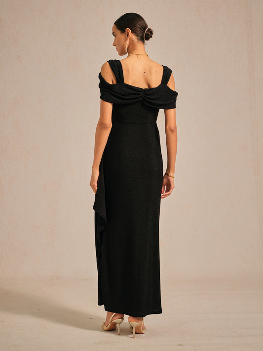 Elegant Sequin Evening Gown with Boat Neck and Slit Cuffs
