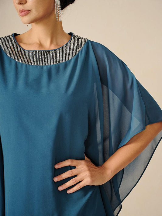 Metallic Pleated Chiffon Midi Dress with Beaded Round Neck