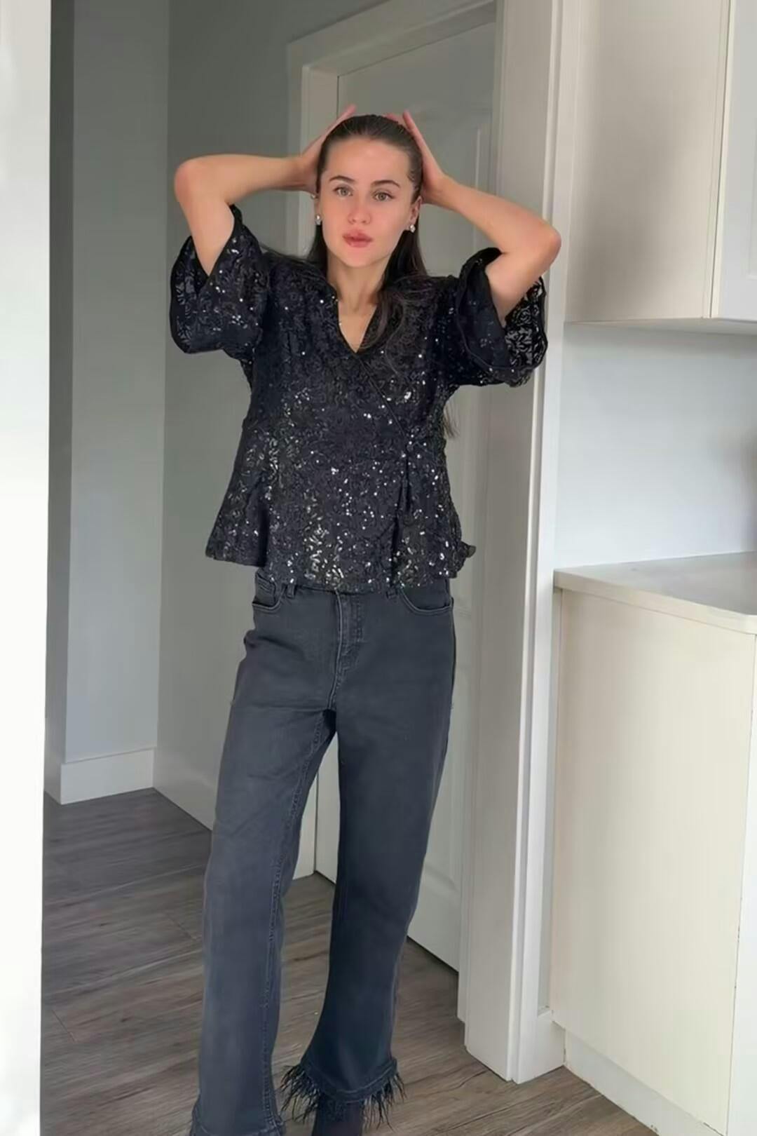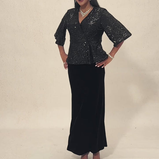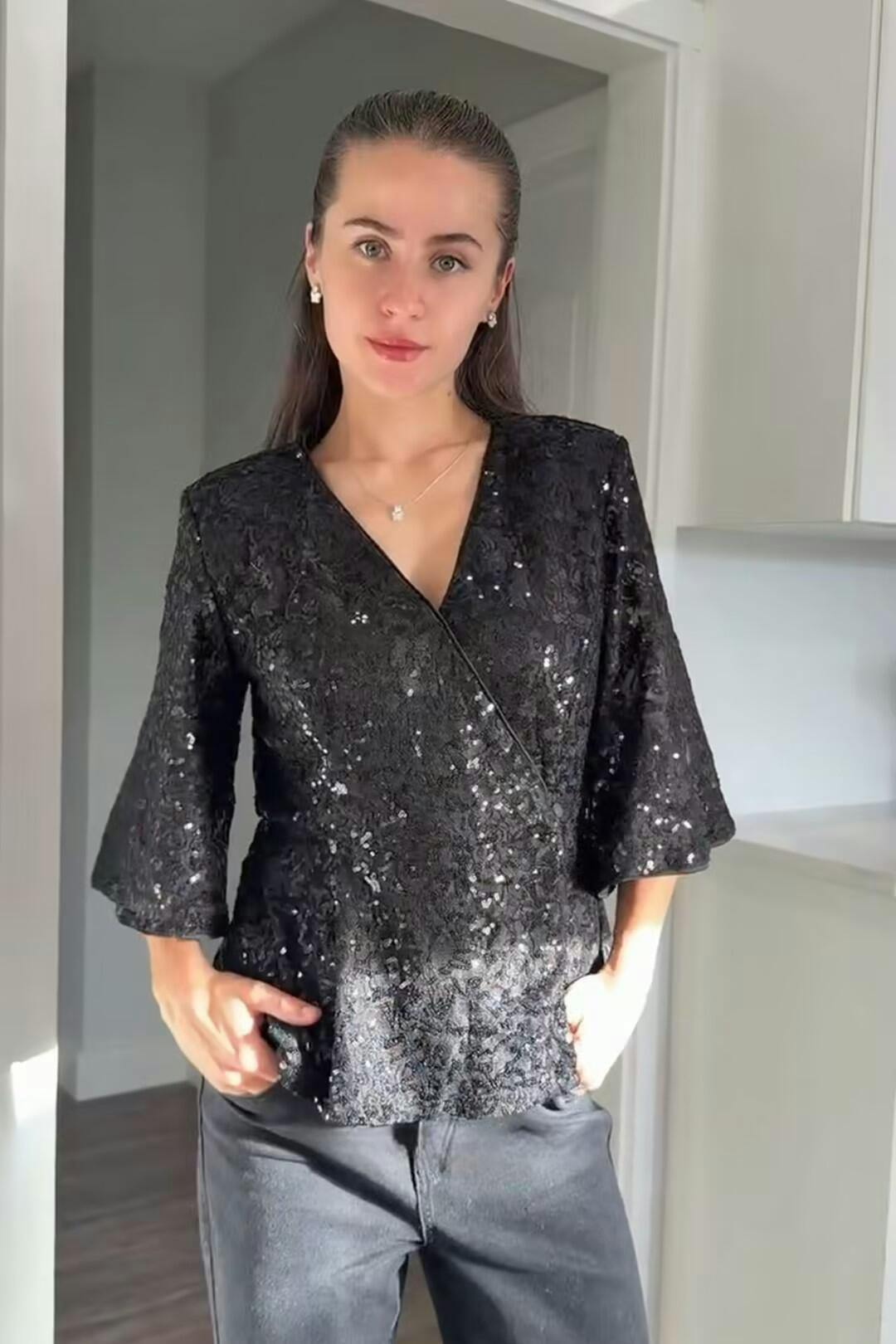This blouse blends elegance and comfort, crafted from stretch lace adorned with delicate sequins for a touch of sparkle. The side closure design offers a polished finish, while the graceful A-line sleeves add feminine charm. Perfect for pairing with skirts or tailored pants, this blouse is ideal for weddings, cocktail parties, or evening gatherings.