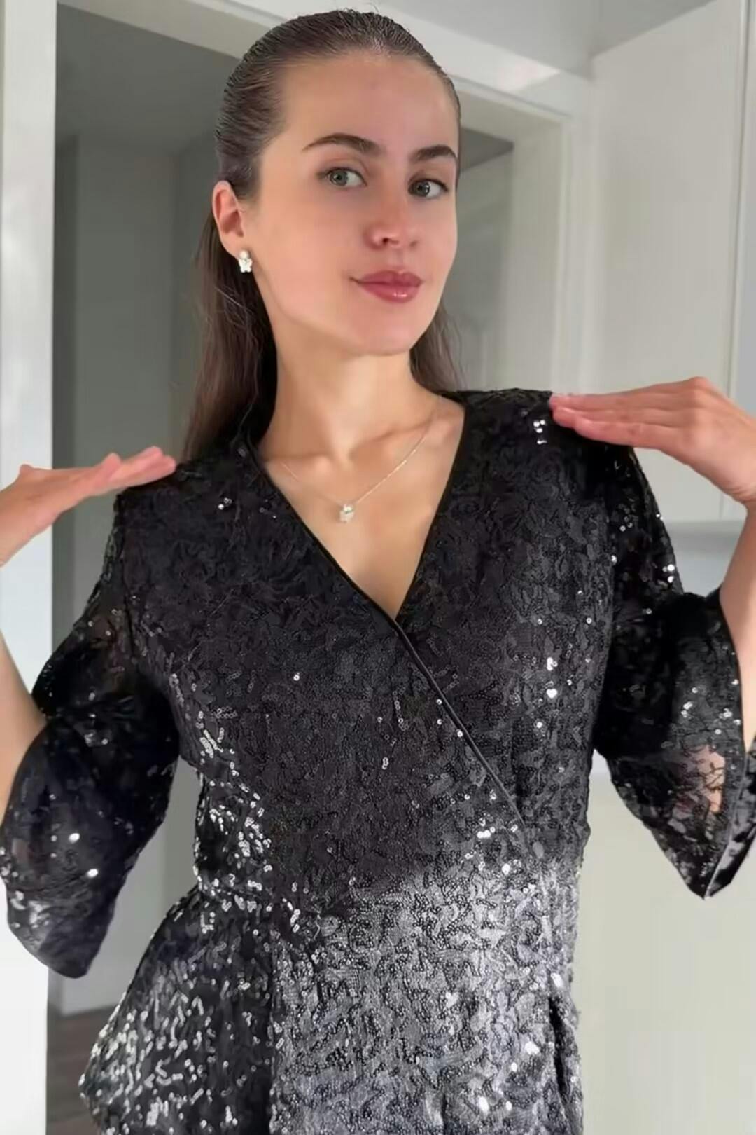 - Design : 3/4 sleeves, A-line sleeves, side closure, sequin accents, fitted silhouette