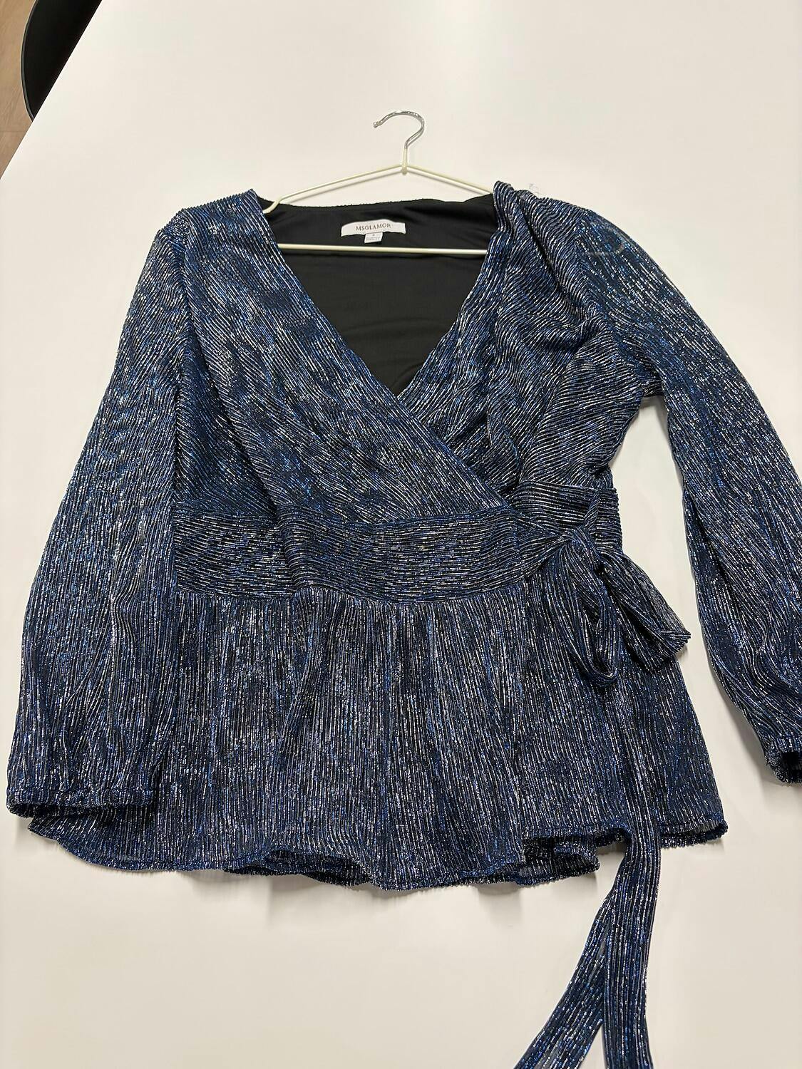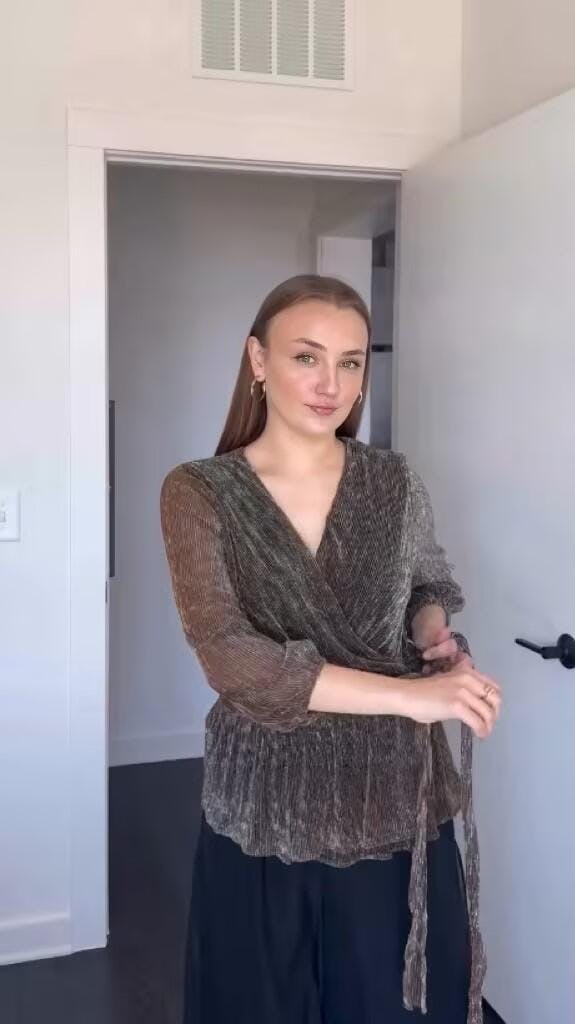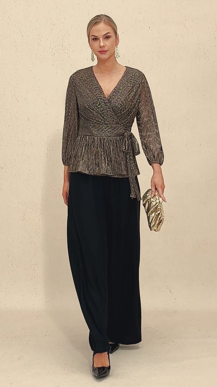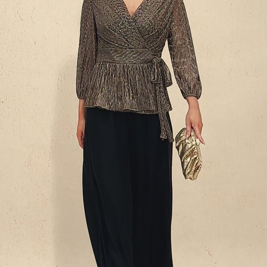 Shine effortlessly in this metallic pleated chiffon wrap top, designed to flatter with a feminine silhouette. The elegant wrap style highlights the waist while offering a graceful drape, complemented by 3/4 sleeves with elastic cuffs and a comfortable stretch lining for all-day comfort. Crafted from?lightweight shimmering pleated chiffon, this blouse brings both sophistication and versatility.Perfect for pairing with skirts, trousers, this versatile piece is ideal for evening events, parties, or festive gatherings.