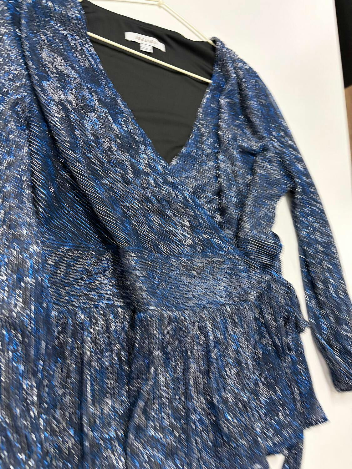 - Fabric: Metallic pleated chiffon, lightweight, subtle shimmer
