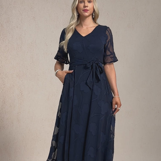 This lace dress offers a touch of elegance, ideal for a wedding guest or cocktail party look.Part of our signature Burning Petals collection,it's a timeless classic featuring a refined V-neckline and soft flutter sleeves. The classic A-line silhouette is accented by delicate ruffle details, enhancing its graceful appeal.