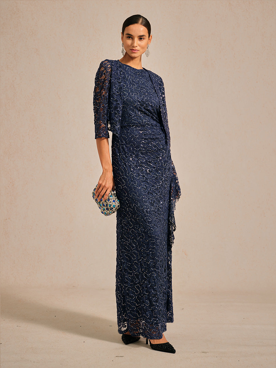 This stretch lace sequin jacket dazzles with every movement, catching the light beautifully to add sparkle to your outfit. Tailored with flattering 3/4 sleeves and a waist-length cut, it creates a polished and elegant silhouette. Perfectly designed to pair with a matching lace dress, this ensemble ensures a cohesive and refined look. Ideal for weddings, cocktail parties, evening events, or any formal occasion where you want to make a graceful statement.