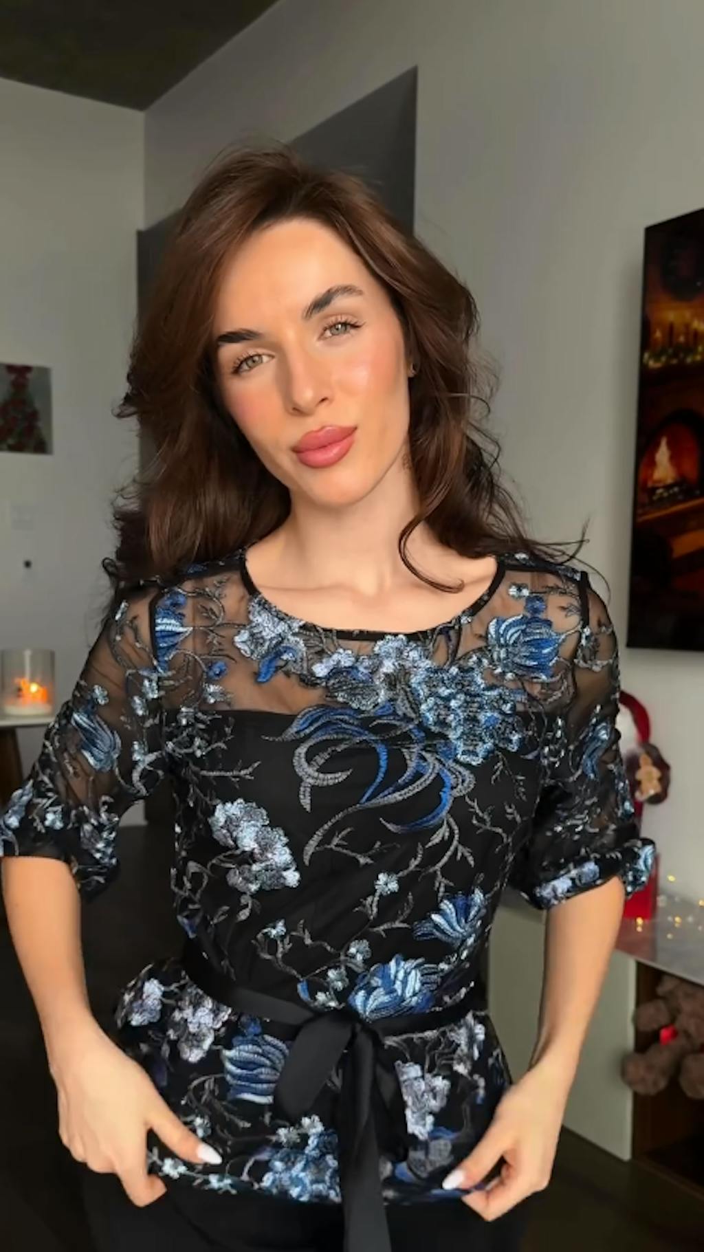 - Design: Floral embroidery, 3/4 bubble sleeves, illusion neckline, tie belt
