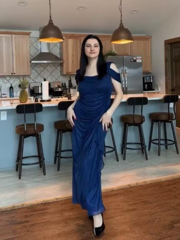 - Design: Cold shoulder sleeves, draped skirt silhouette, cowl neckline, flattering waistline, floor-length hem
