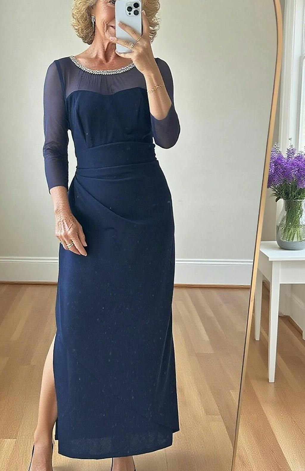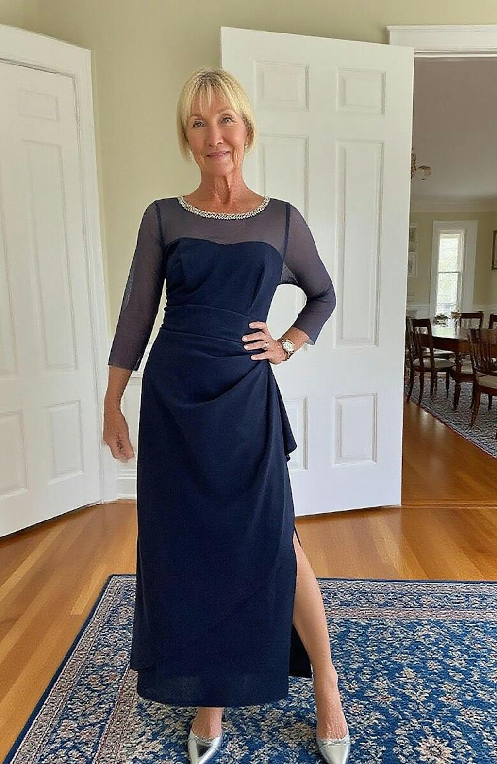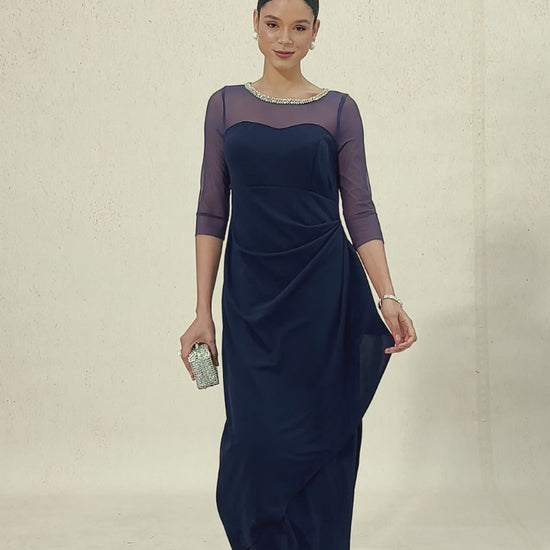 - Design: Beaded illusion neckline, fitted elbow-length sleeves, sheath silhouette, back zipper, ankle-length hem