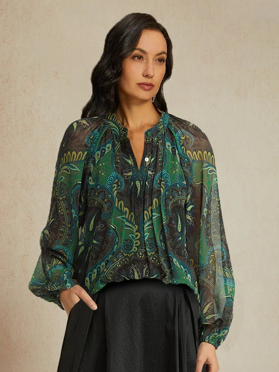 V-neck, High-low hem, Ruffle sleeves, Paisley print, 3/4 sleeves