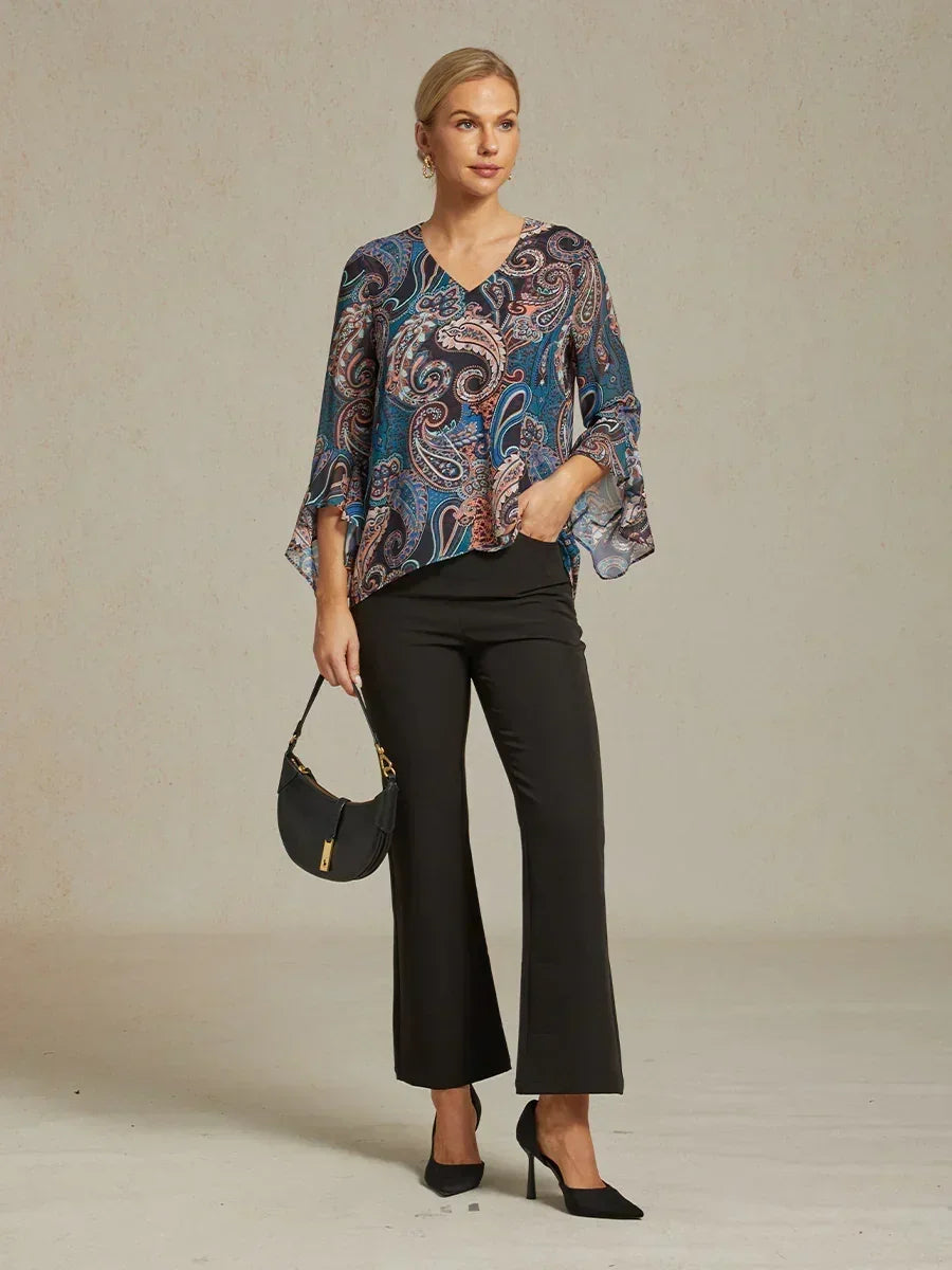 V-neck, High-low hem, Ruffle sleeves, Paisley print, 3/4 sleeves