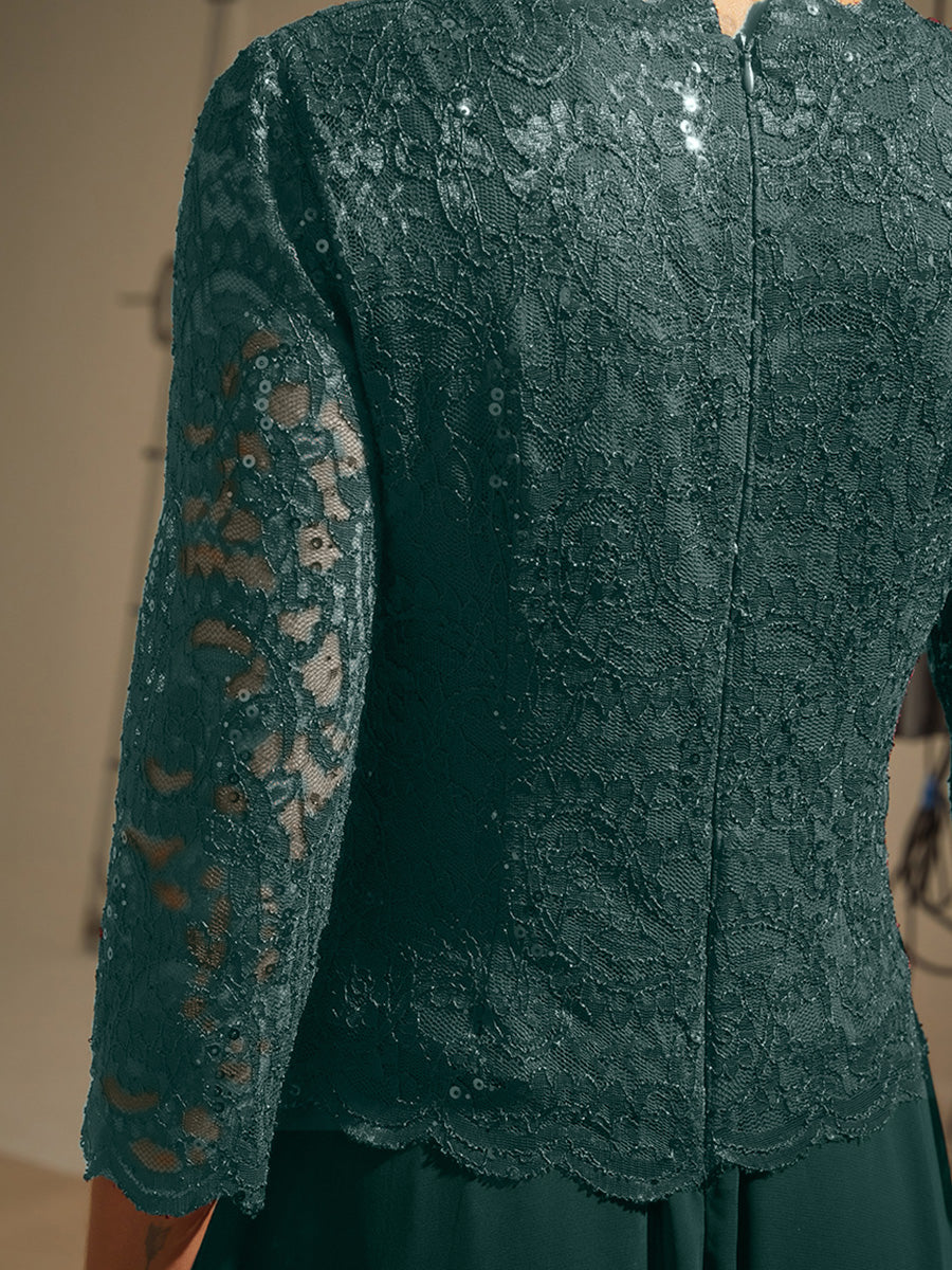 This refined floor-length dress creates the illusion of a two-piece ensemble with its dazzling sequin lace bodice and flowy chiffon skirt. Sheer lace sleeves offer graceful coverage, while scalloped edges at the neckline and cuffs add a soft romantic touch. Perfect for mothers of the bride or groom, this design exudes timeless elegance and effortless sophistication for weddings and formal gatherings.