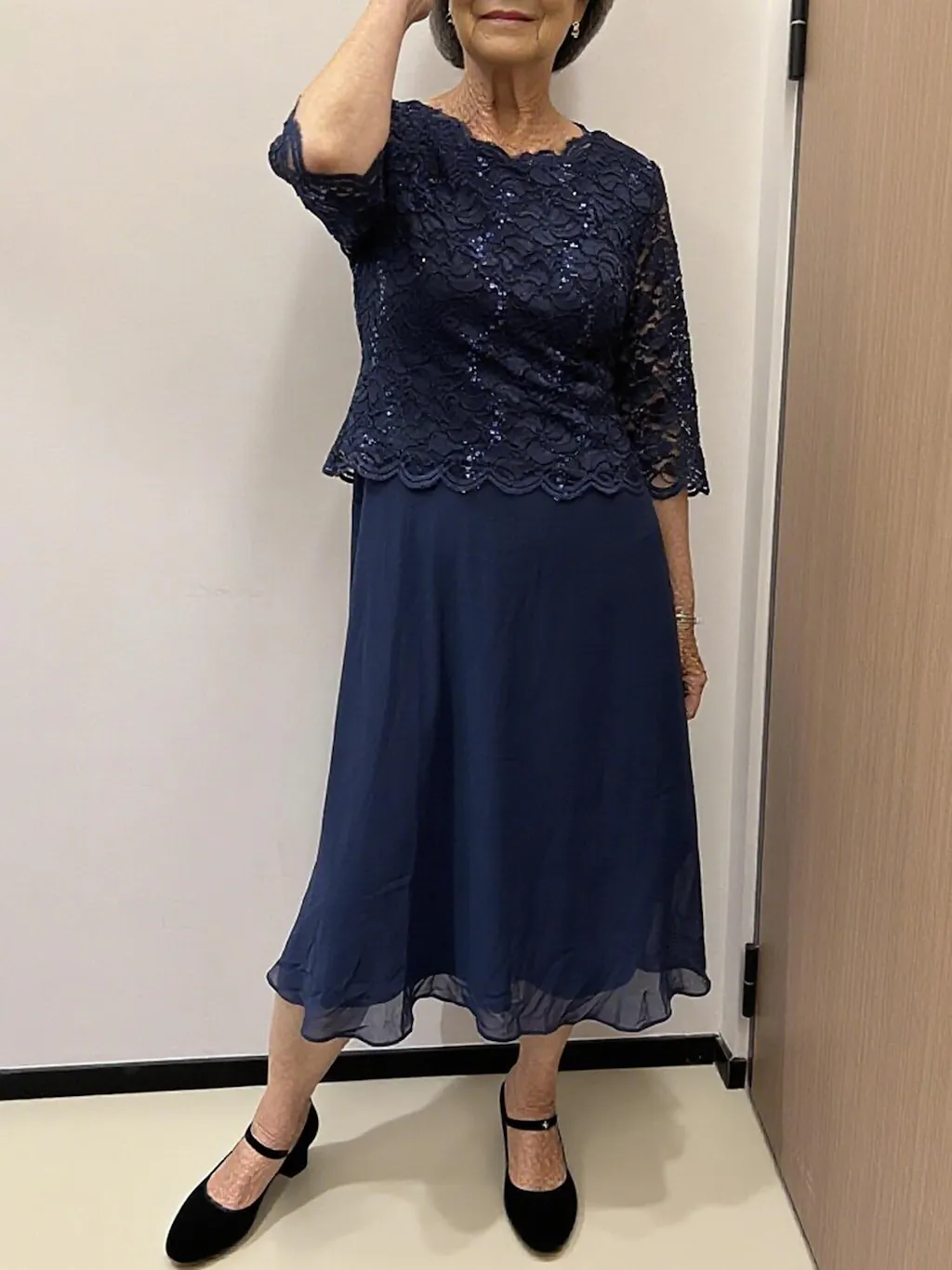This refined tea-length dress creates the illusion of a two-piece ensemble with its dazzling sequin lace bodice and flowy chiffon skirt. Sheer lace sleeves offer graceful coverage, while scalloped edges at the neckline and cuffs add a soft romantic touch. Perfect for mothers of the bride or groom, this design exudes timeless elegance and effortless sophistication for weddings and formal gatherings.