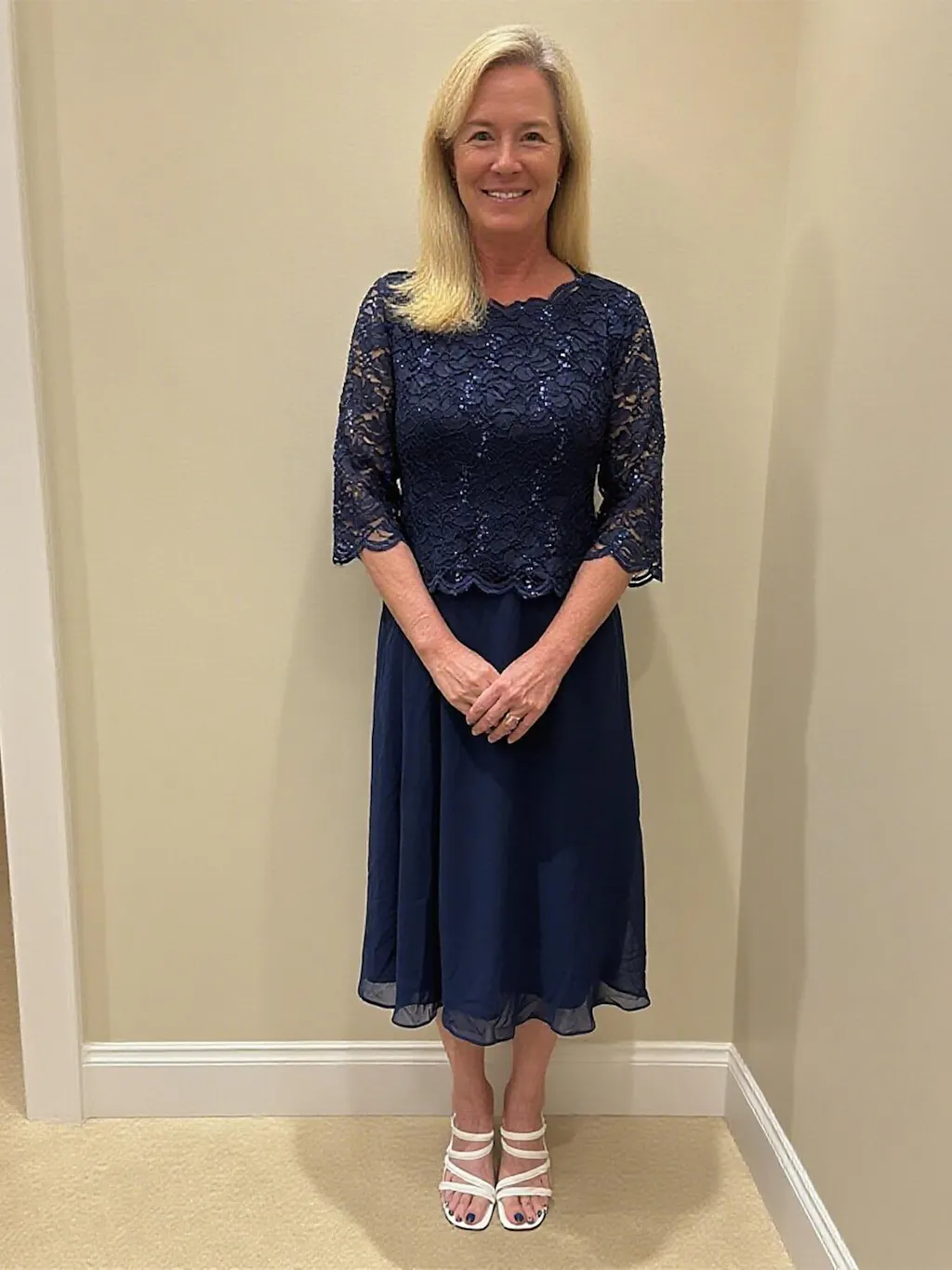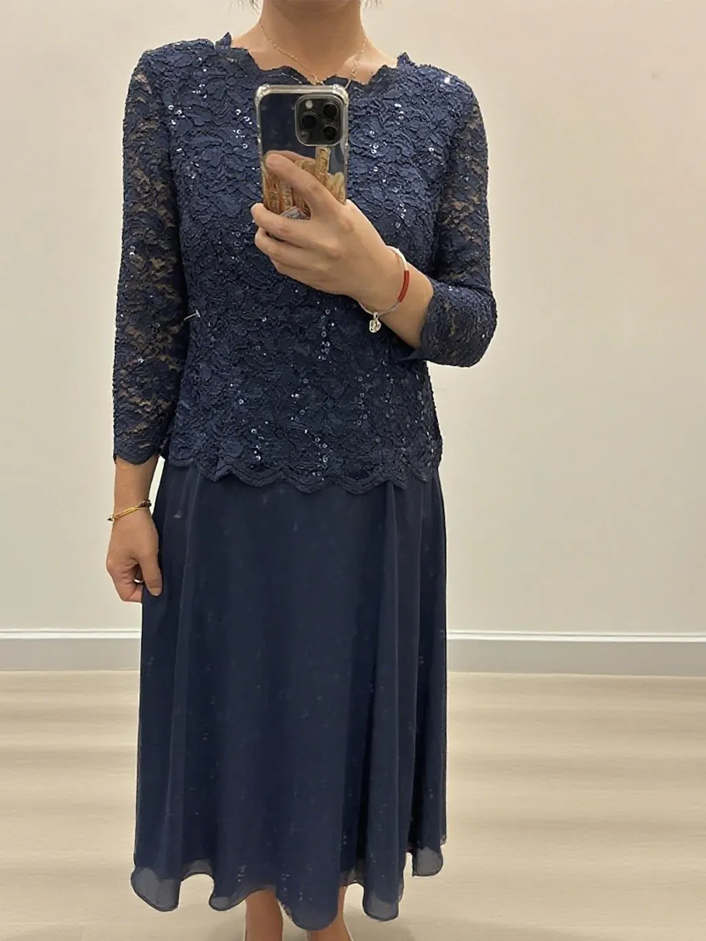 - Design: Mock two-piece design, sheer lace sleeves, scalloped lace trim, tea-length skirt, sequin embroidery