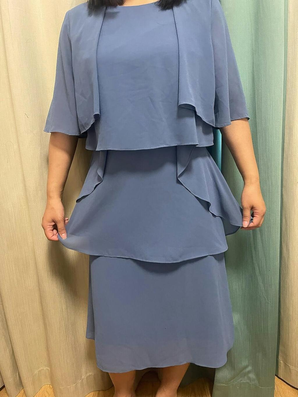 This elegant layered chiffon dress features a soft, flowing silhouette in a calming blue hue. With a round neckline and flutter sleeves, it exudes a romantic and feminine style. The lightweight chiffon fabric offers breathability and comfort, making it ideal for summer gatherings or formal occasions. Its graceful layers and airy feel provide a touch of sophistication and ease, perfect for special events or cocktail parties, ensuring both style and comfort.