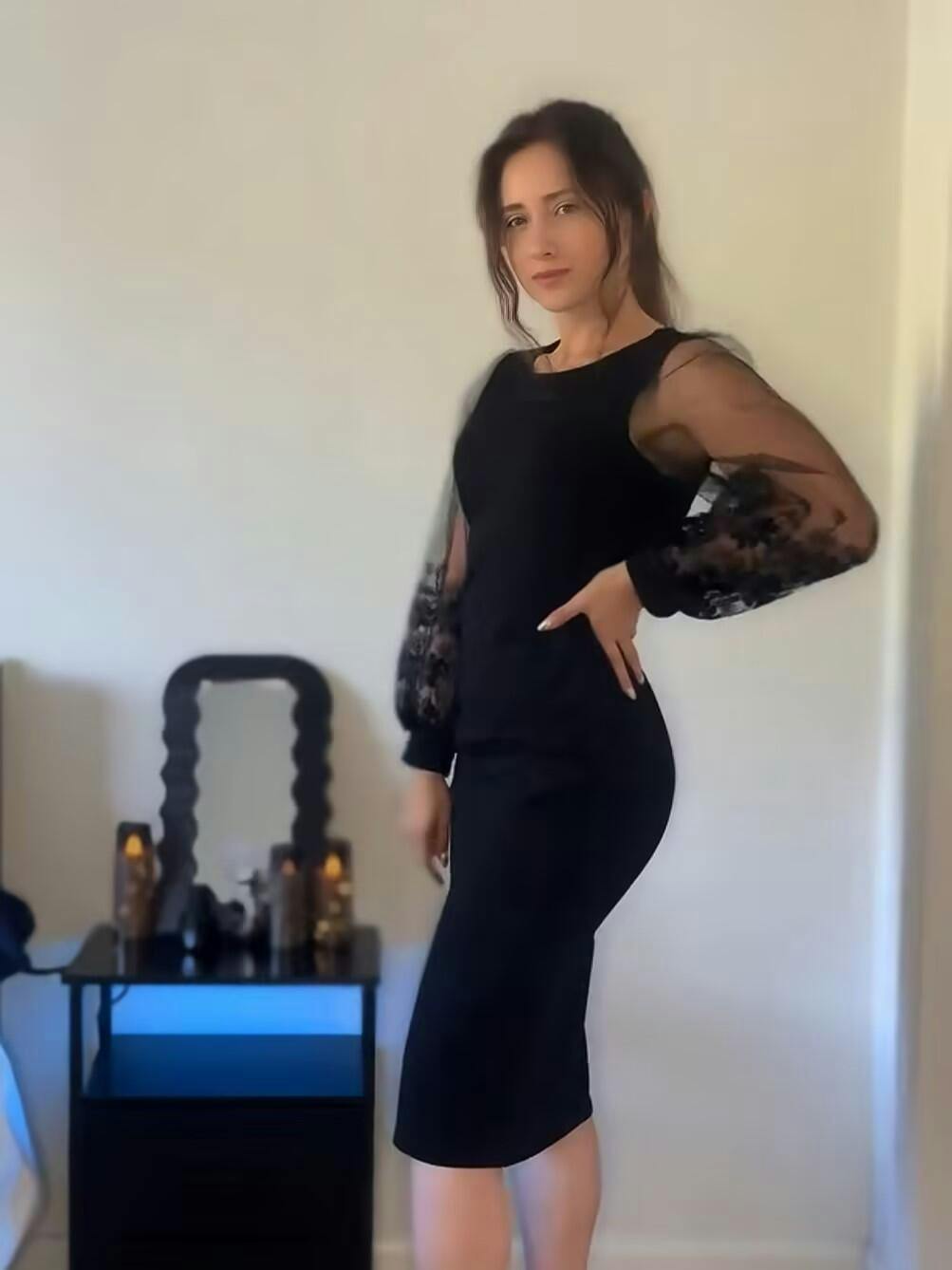 This curve-flattering black bodycon dress features exquisite 3D floral embroidery on sheer long sleeves, combining sophistication with a playful touch. The midi length strikes the perfect balance between elegance and comfort, while the cotton-spandex blend offers gentle compression for all-day wear