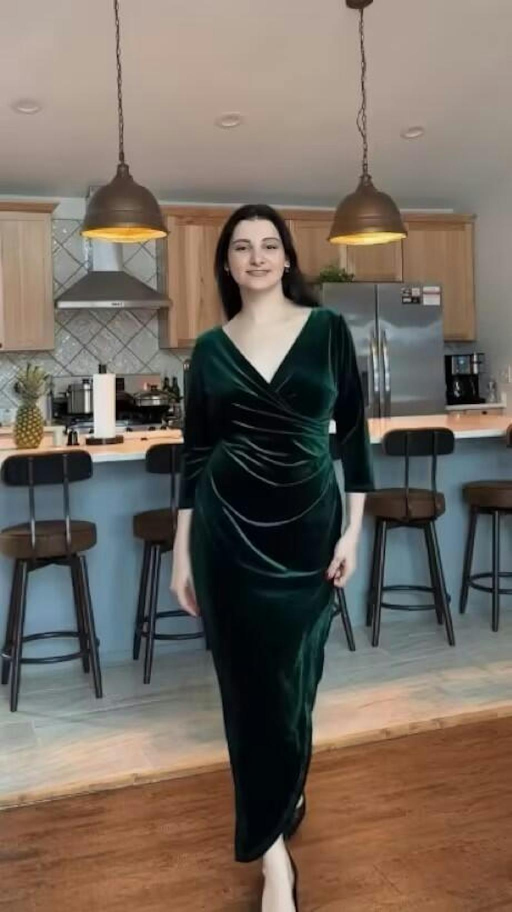 Long Stretch Velvet Evening Dress with 3/4 Sleeves