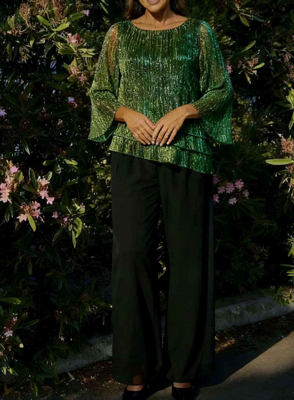 Add a touch of modern elegance to your wardrobe with this asymmetrical layered blouse, crafted from metallic pleated chiffon with subtle stretch. The round neckline and cascading layers create a sophisticated silhouette, while the lightweight fabric drapes beautifully over the body. Perfect for pairing with skirts, trousers, or layered over dresses, this versatile top is ideal for evening events, parties, and formal occasions.