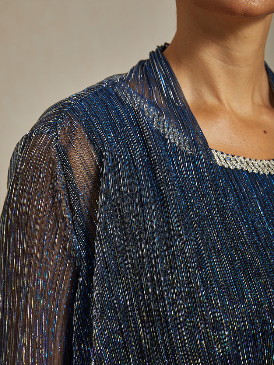Metallic Pleated Chiffon Long Jacket with Layered Design