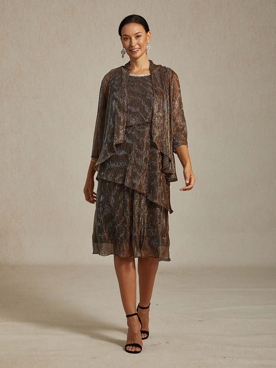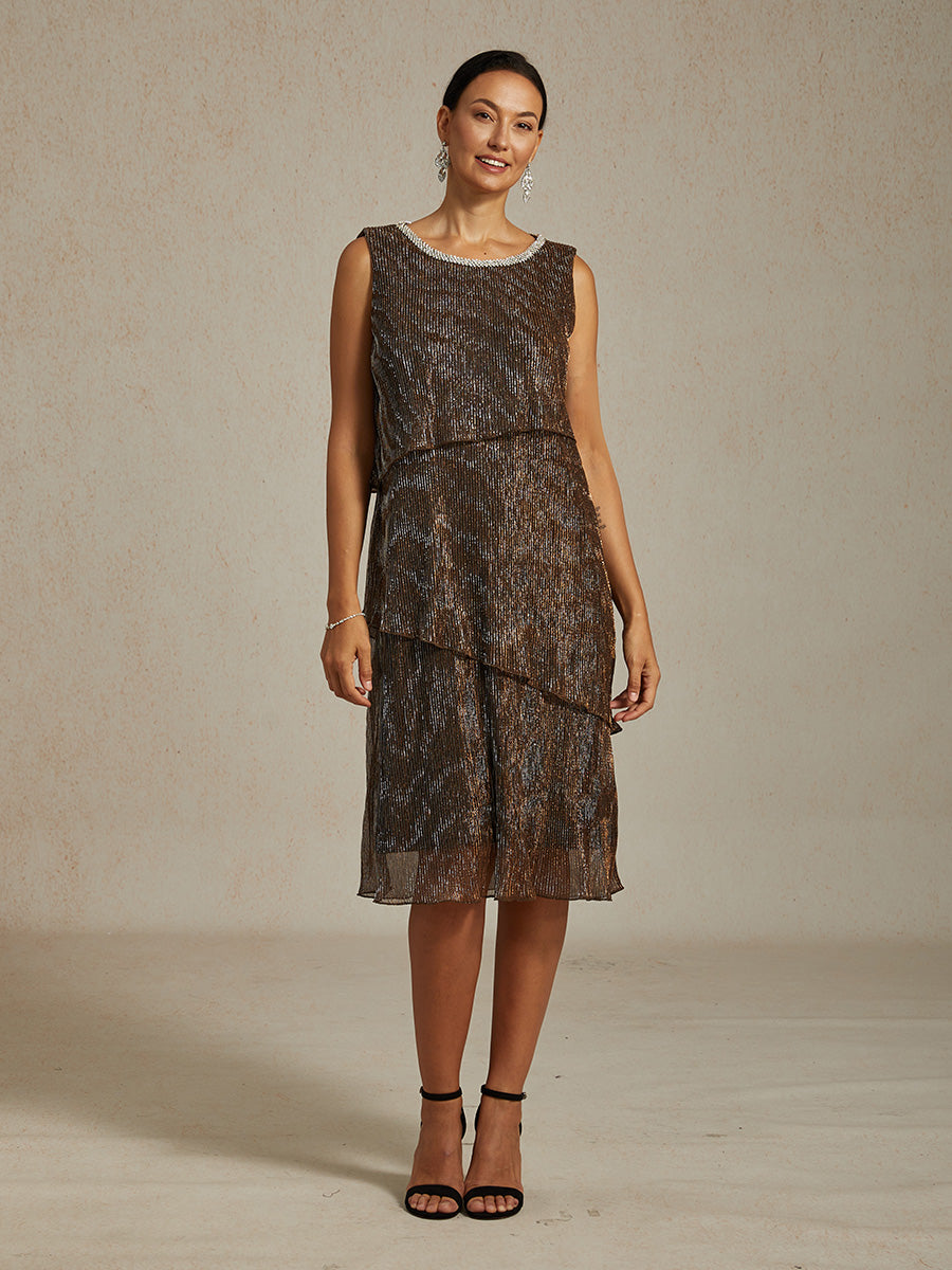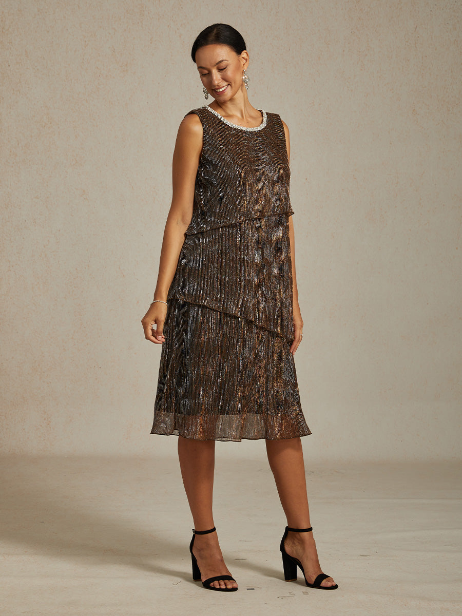 This elegant metallic pleated chiffon midi dress features a beaded round neckline and layered design, adding dimension and sophistication. The stretch lining ensures comfort while maintaining a flattering silhouette. Perfect for evening events, parties, or formal occasions. Can be paired with the matching cardigan for a complete look.