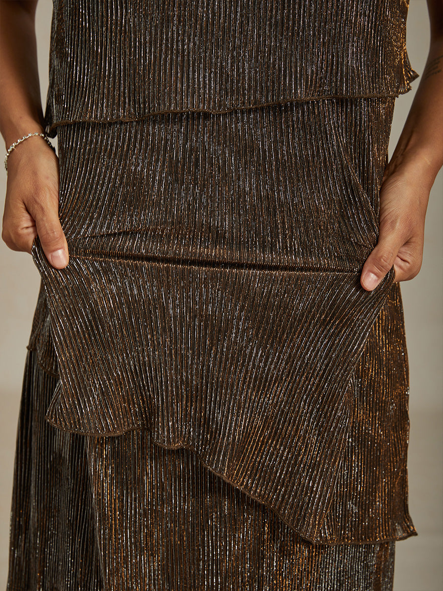 - Fabric: Metallic pleated chiffon, lightweight, subtle shimmer