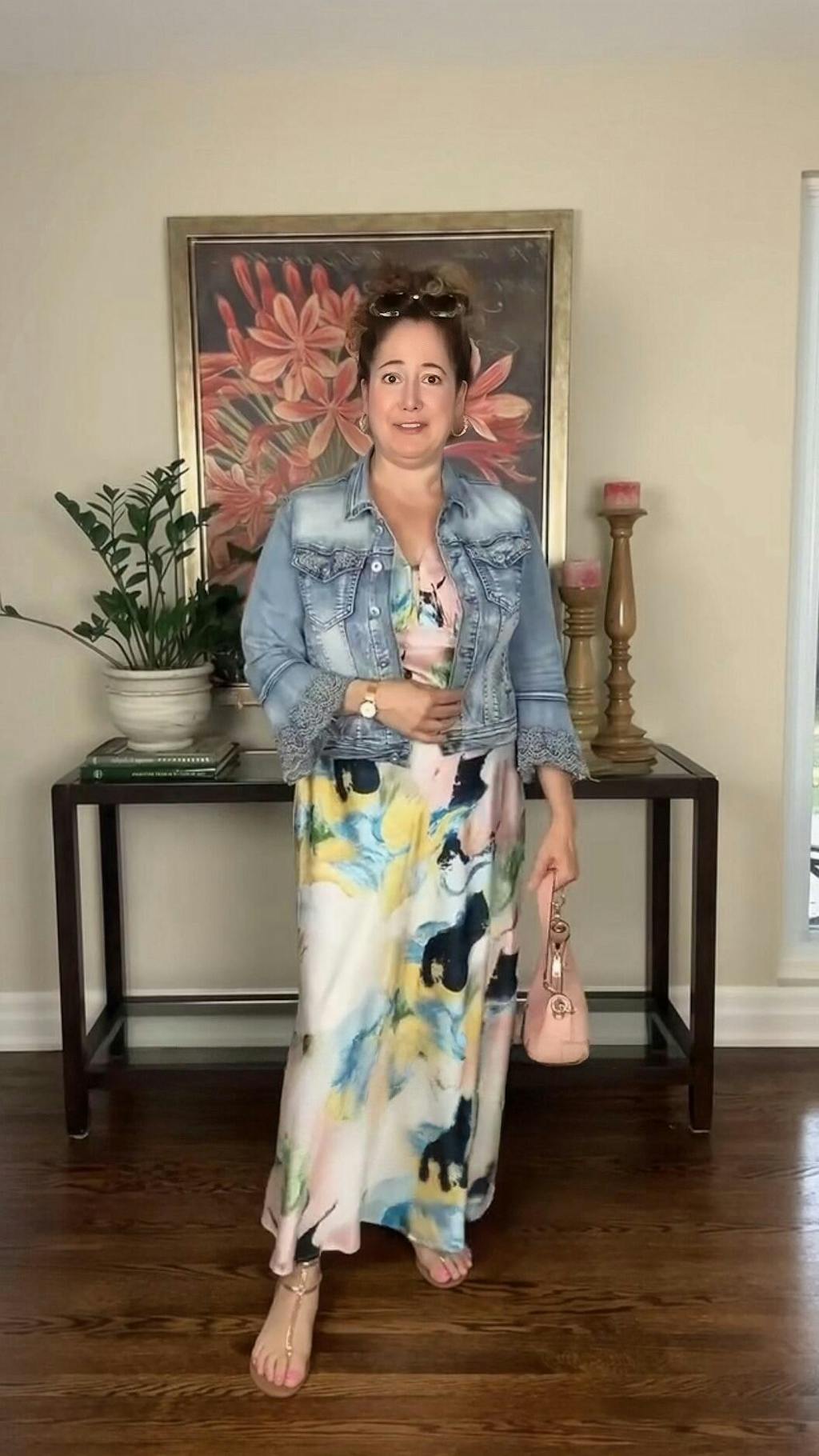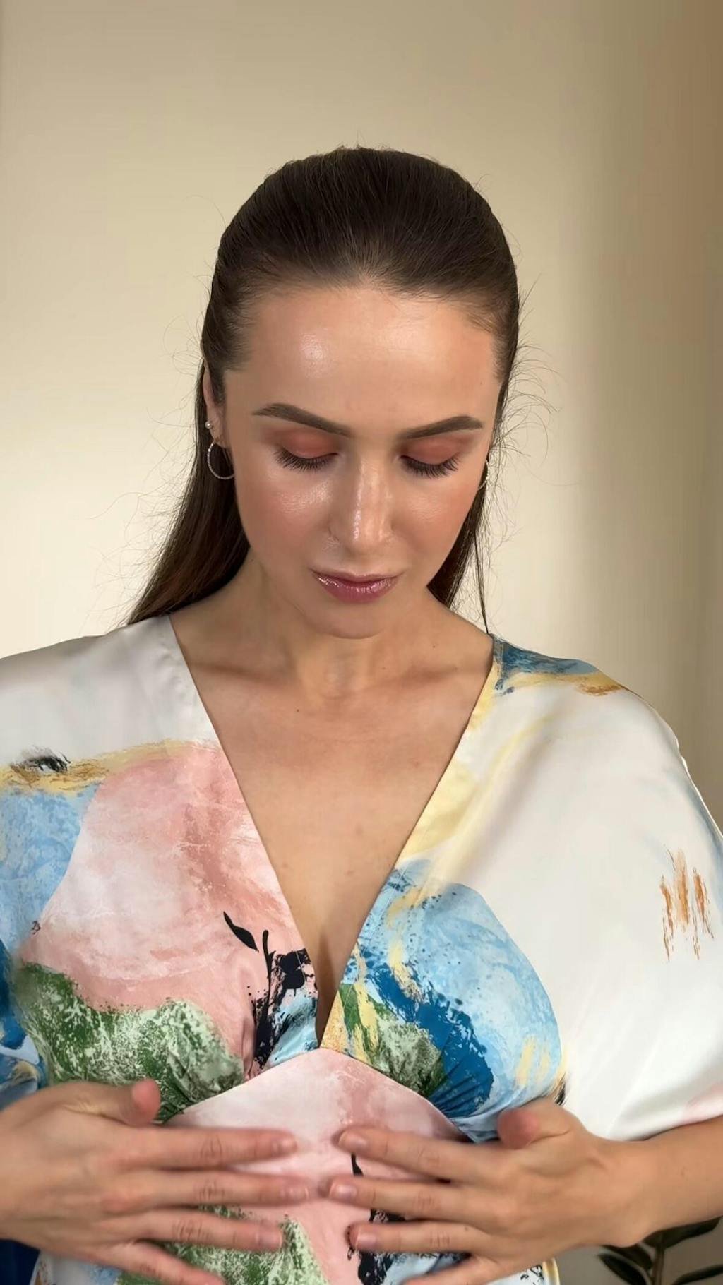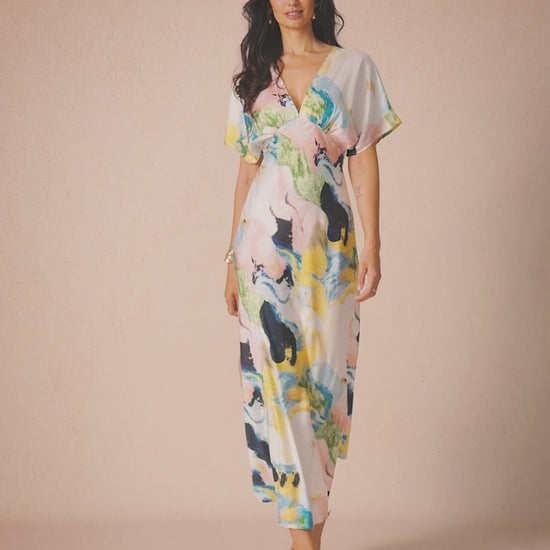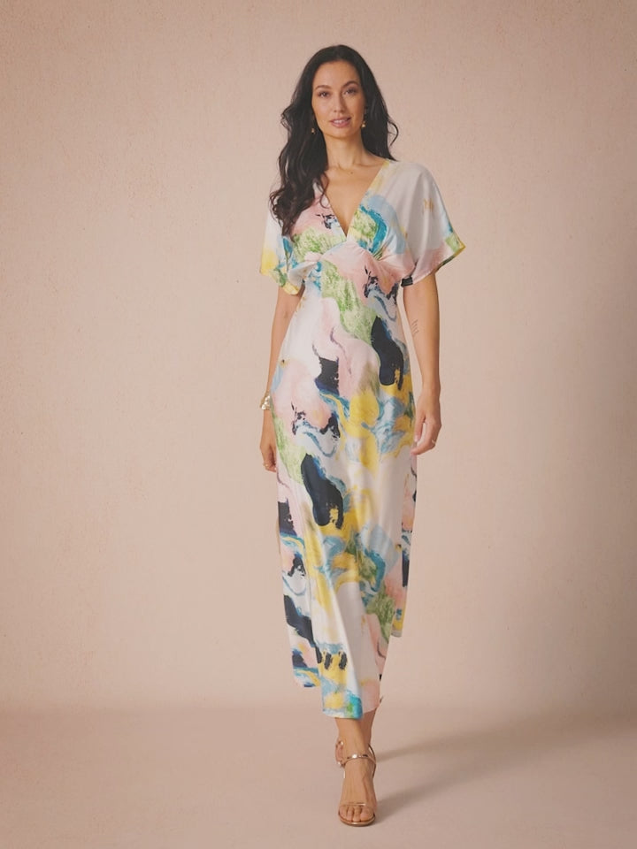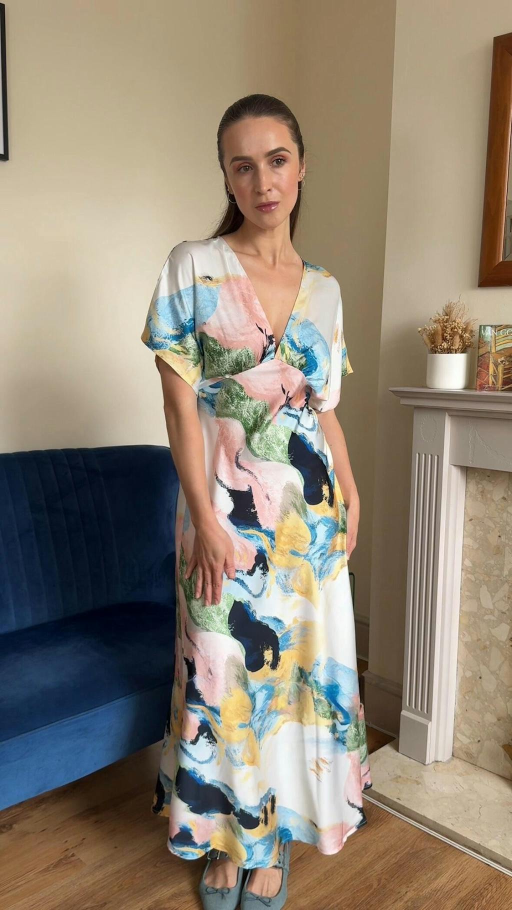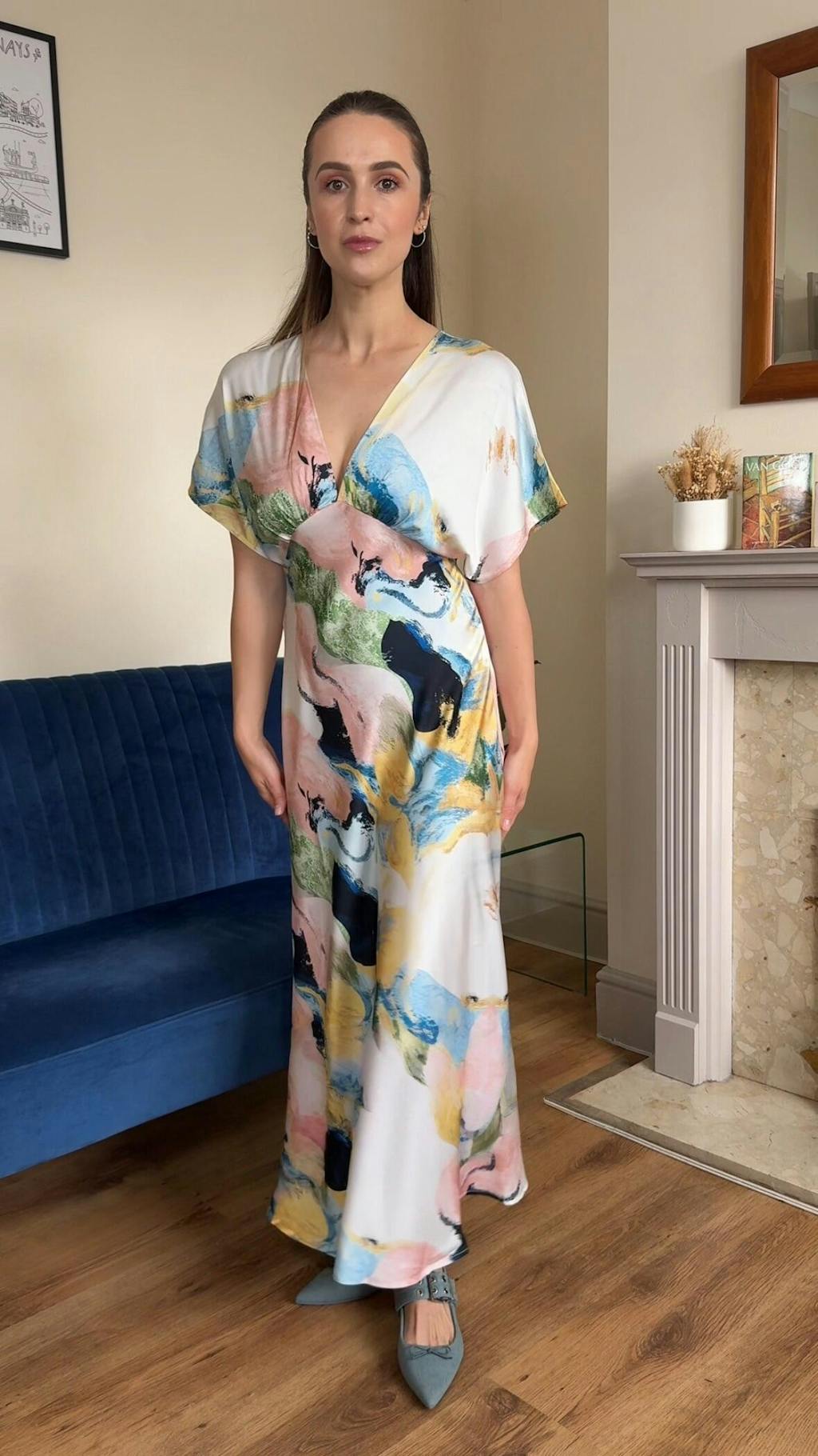 This elegant wrap-style satin maxi dress features a vivid abstract print and a flowy silhouette that flatters every figure. The sleeves and draped cut create a graceful, airy feel, while the smooth satin fabric adds a touch of luxury. Ideal for summer parties, dinners, or any event where elegance meets ease.