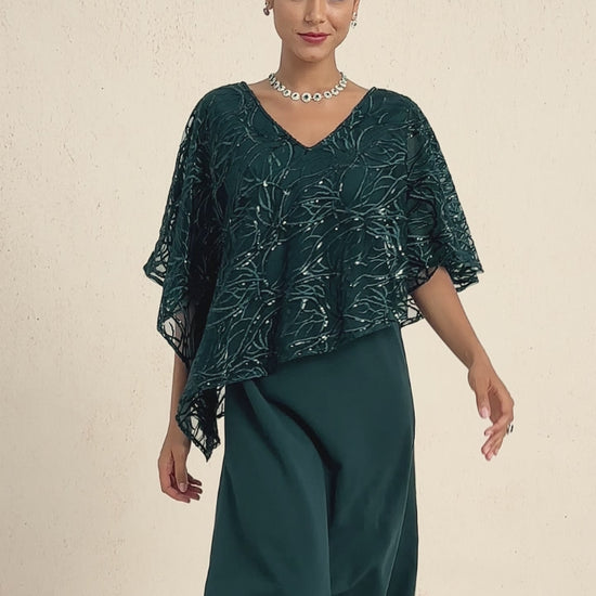 This elegant one-piece dress features a sleeveless A-line silhouette layered with an embroidered sequin chiffon overlay. The cape-style overlay adds graceful coverage with asymmetric hem and half sleeves, while the inner dress is crafted from high-stretch fabric for a flattering and comfortable fit. Perfect for weddings, formal events, and special dinners, this dress offers the look of a coordinated set in a single effortless piece.