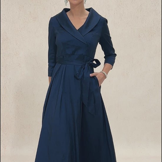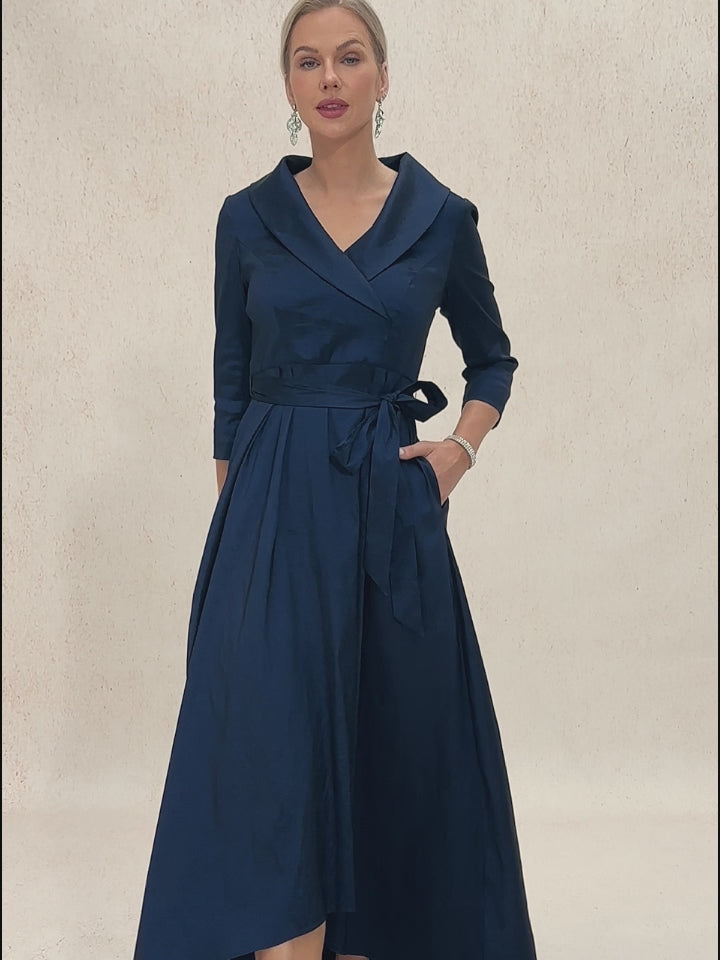 Turn heads in this collar stretch taffeta dress, designed with a playful high low hem and a flattering tie belt that cinches your waist beautifully. Crafted from luxurious stretch taffeta, it hugs your curves while offering comfort and elegance. Whether you're stepping out for a wedding, evening party, or a formal dinner, this dress is your go-to for timeless sophistication. Add heels and a bold necklace to complete the look, and you're sure to shine wherever you go.