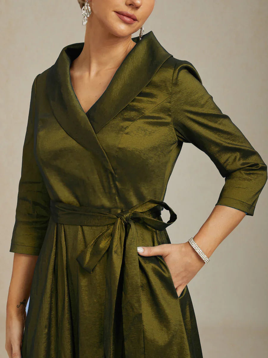 3/4 Sleeve Stretch Taffeta Blouse with Tie Waist Detail