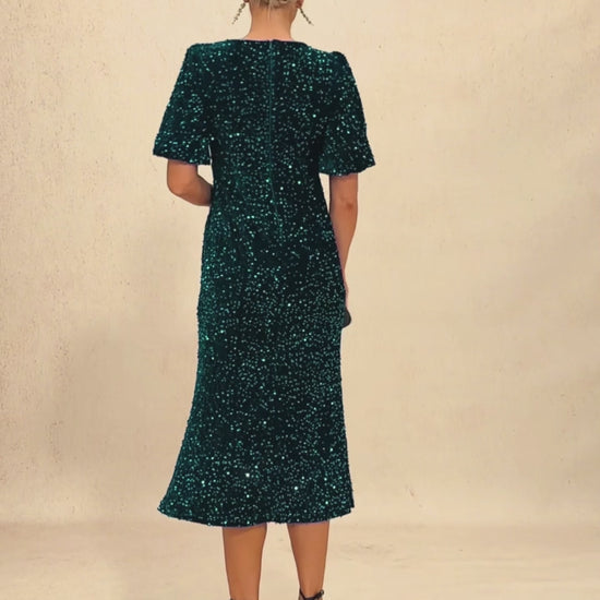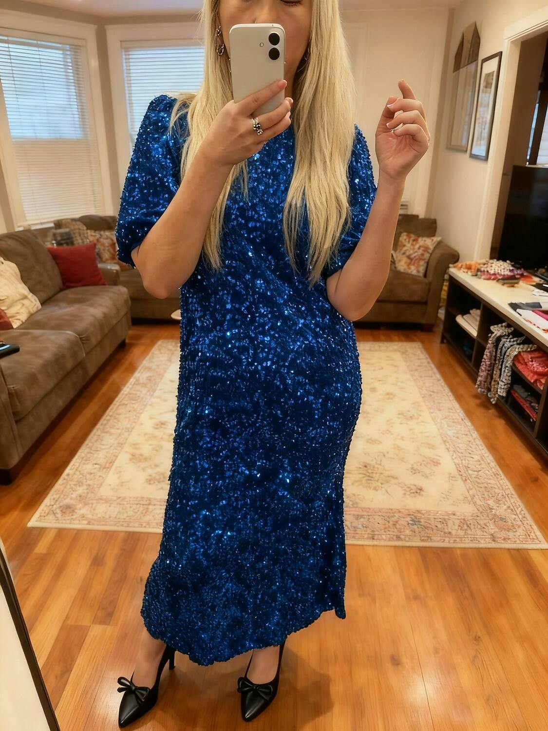 Turn heads in this elegant sequin velvet midi dress, crafted from stretch velvet with sparkling sequins. Featuring mid-length puff sleeves, a flattering sheath-to-A-line silhouette, and a soft stretch lining, this dress combines comfort with sophistication. Falling to mid-calf, it’s perfect for birthday parties, cocktail events, or any festive occasion where you want to shine.