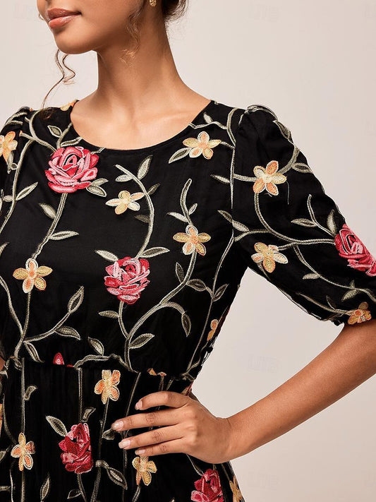 Floral Embroidered Blouse with 3/4 Bubble Sleeves & Illusion Neckline