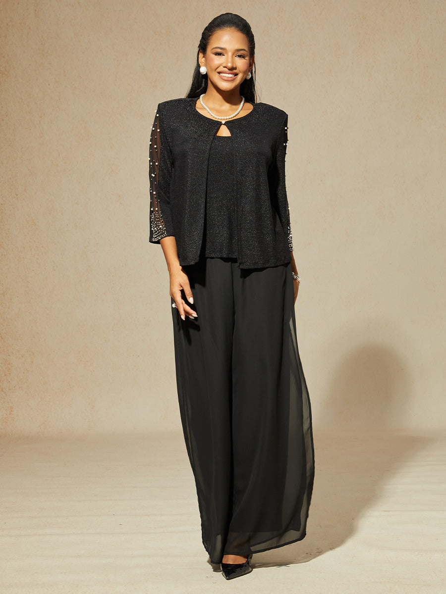 珠飾細節、幻影雪紡袖、3/4袖長、彈性針織面料